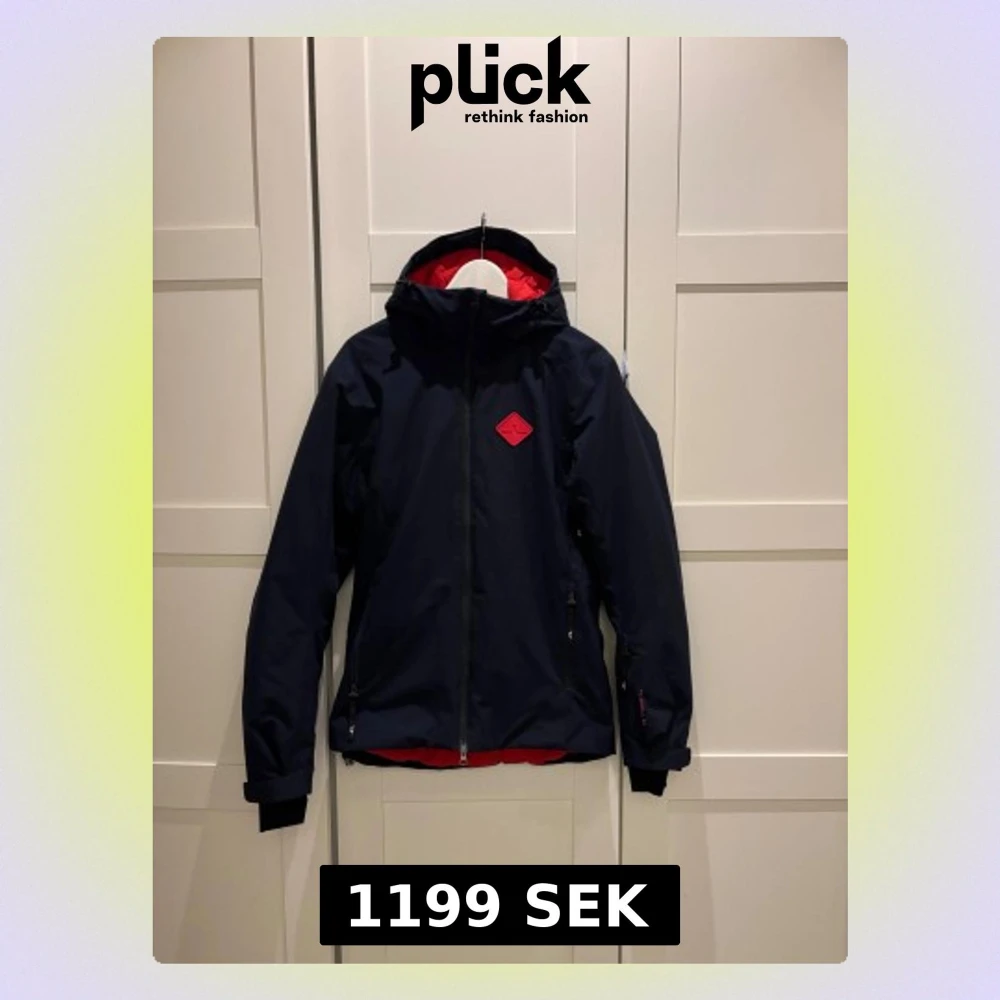 Snygg mörkblå skidjacka från J.Lindeberg med röd insida. Jackan har dragkedja framtill, två sidofickor med dragkedjor och en röd logotyp på bröstet. Perfekt för kalla dagar på berget.