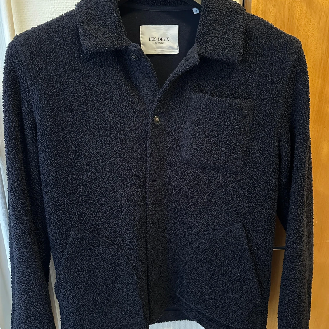 Säljer en snygg mörkblå teddyjacka från Les Deux. Jackan har en klassisk krage och knäppning framtill. Den är långärmad och har två fickor framtill samt en bröstficka. Perfekt för kyligare dagar! Pris kan diskuteras.