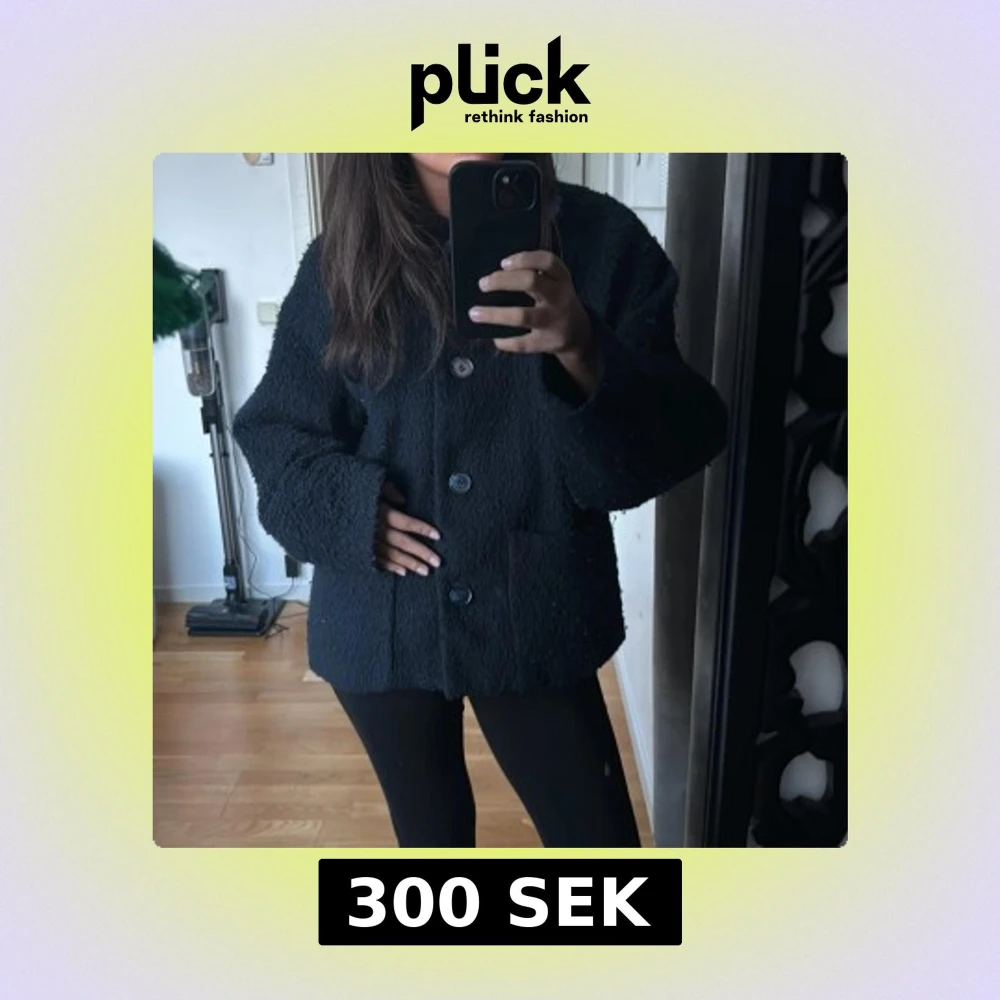 Mysig mörkblå teddyjacka med stora knappar framtill. Jackan har en oversized passform och långa ärmar, perfekt för kyligare dagar. Den har också praktiska fickor på sidorna.
