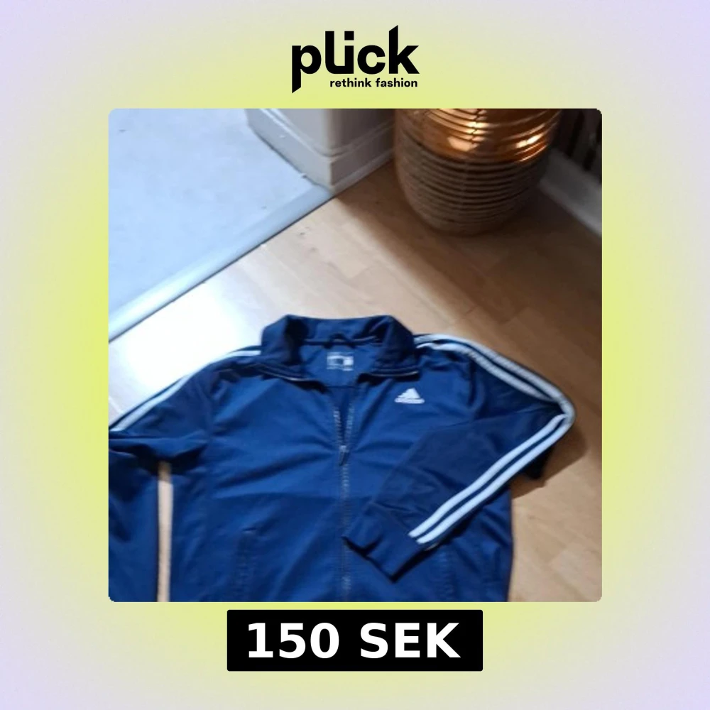 Säljer en mörkblå träningsjacka från Adidas med vita ränder längs ärmarna. Jackan har dragkedja framtill och är långärmad. Perfekt för sportiga aktiviteter och har en klassisk Adidas-look.