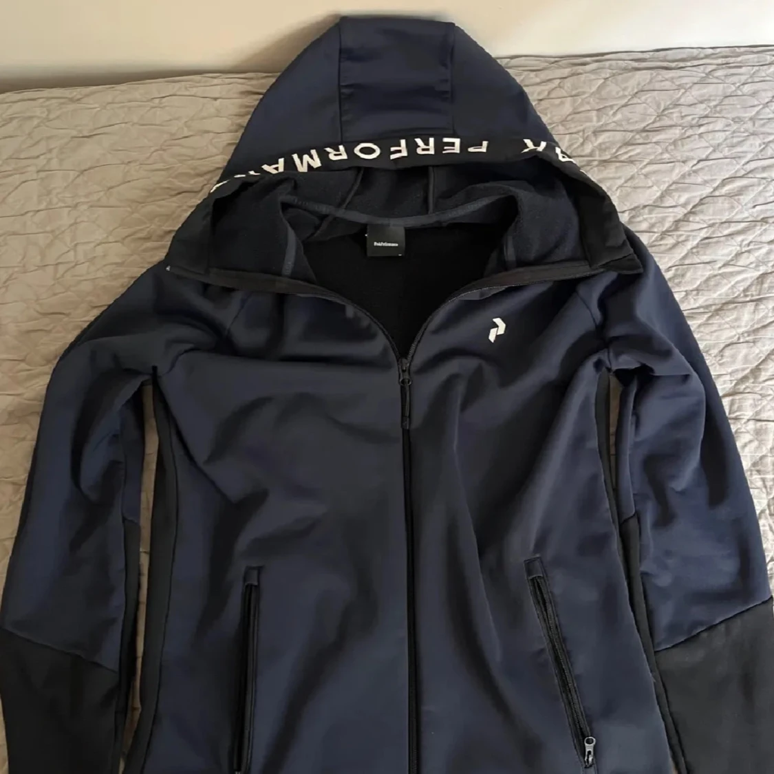 Snygg mörkblå träningsjacka från Peak Performance med dragkedja och huva, strl S i riktigt bra skick. Hör av er ang frågor om tröjan!