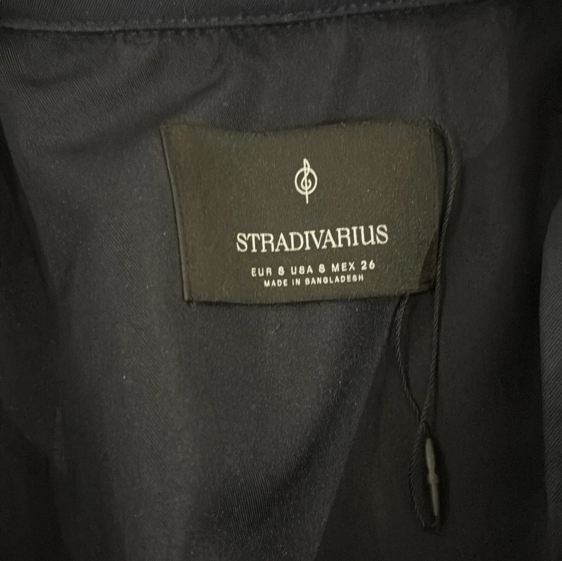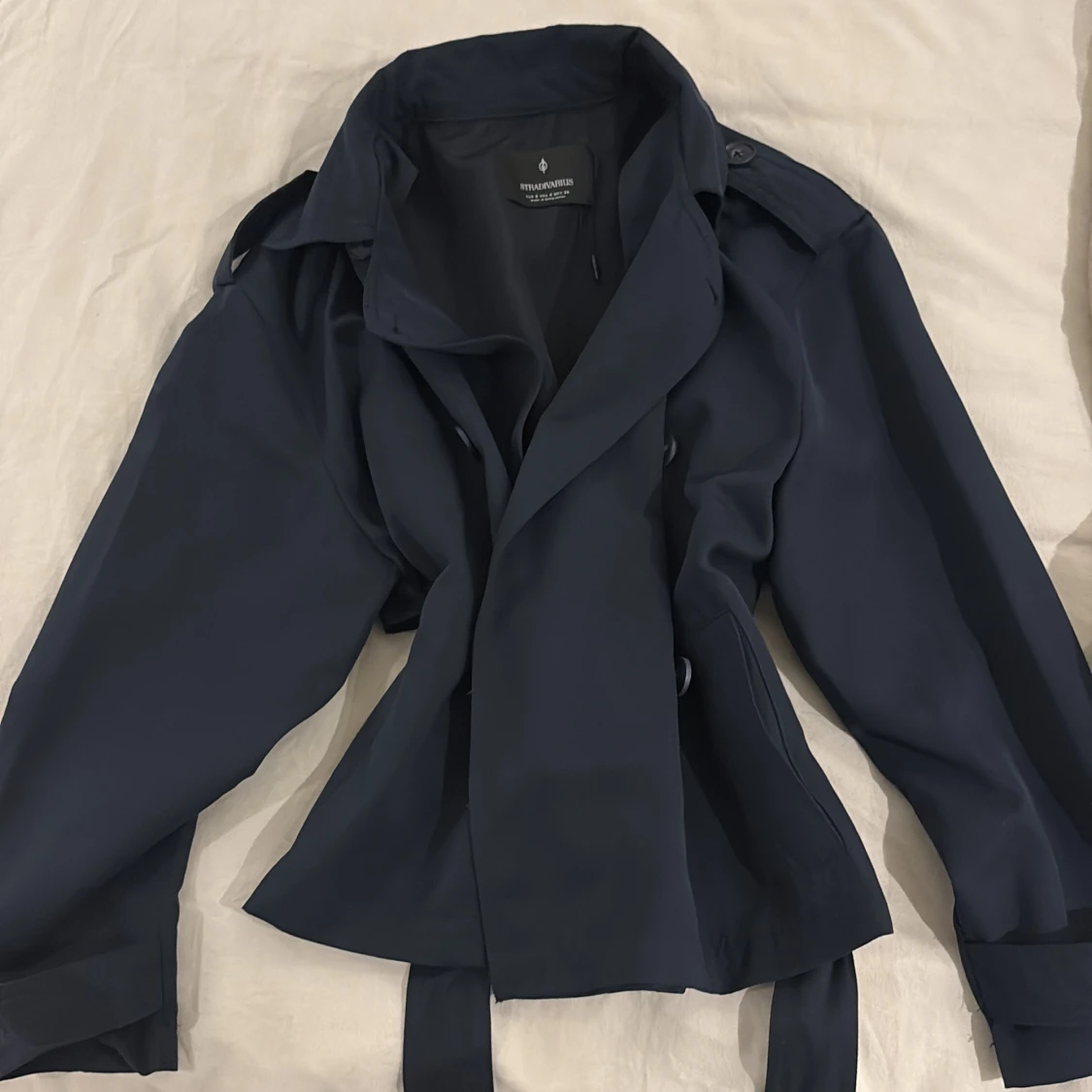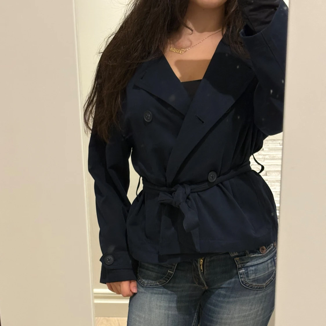 Snygg mörkblå trenchcoat från Stradivarius med knytskärp i midjan och dubbelknäppning. Jackan har klassisk krage, långa ärmar och knappar vid ärmslut. Perfekt för dig som vill ha en stilren och trendig look.