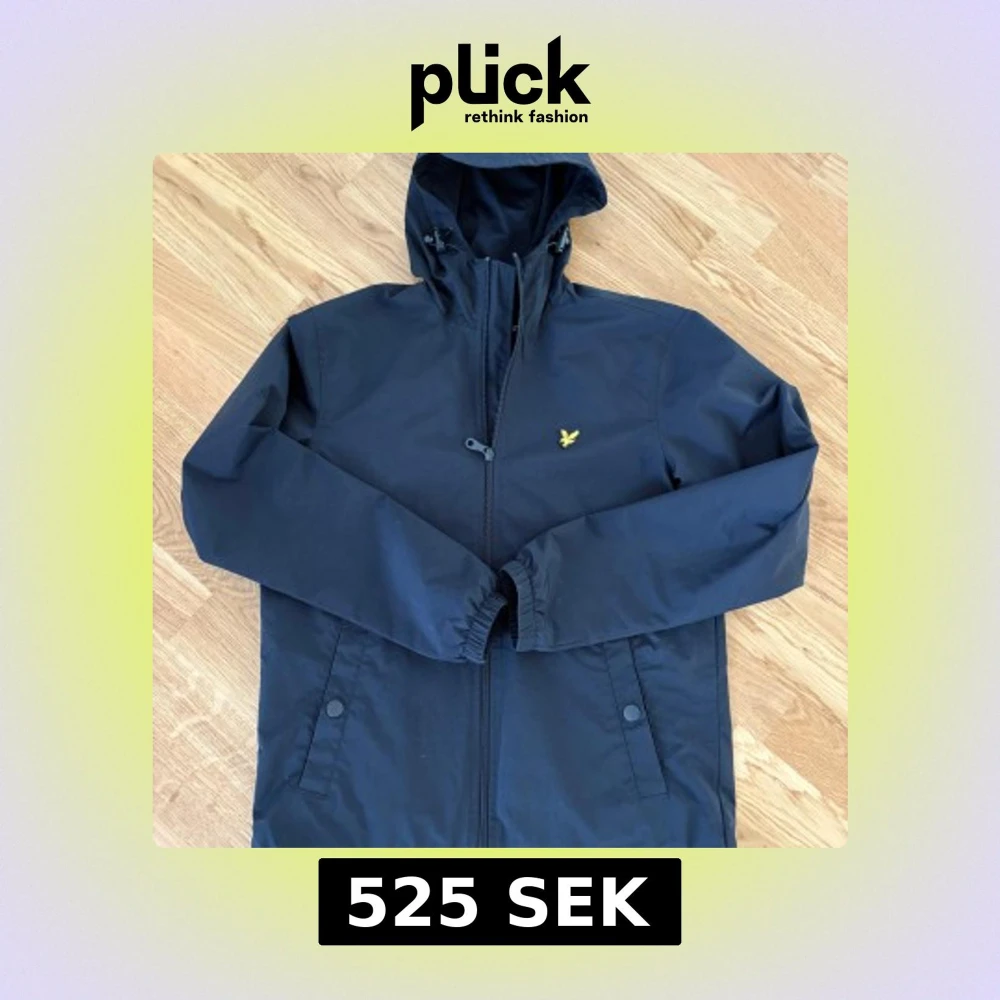 Mörkblå vindjacka från Lyle & Scott med huva och dragkedja framtill. Jackan har två fickor med tryckknappar och den klassiska gula loggan på bröstet. Perfekt för blåsiga dagar och enkel att matcha med allt. Nyskick.