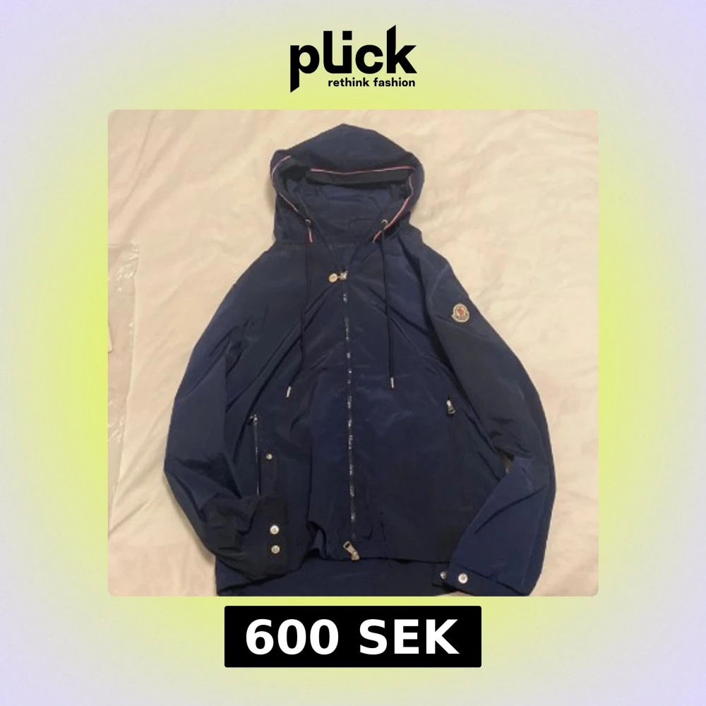 Snygg mörkblå vindjacka från Moncler med huva och dragkedja framtill. Jackan har snörning vid huvan, silverfärgade detaljer och Moncler-logga på ärmen. Tillverkad i lätt polyester, perfekt för blåsiga dagar. Fickor med dragkedja och stilren design. Den har ett liten hål som man kan se på näst sista bilden men man ser inte de så mkt.