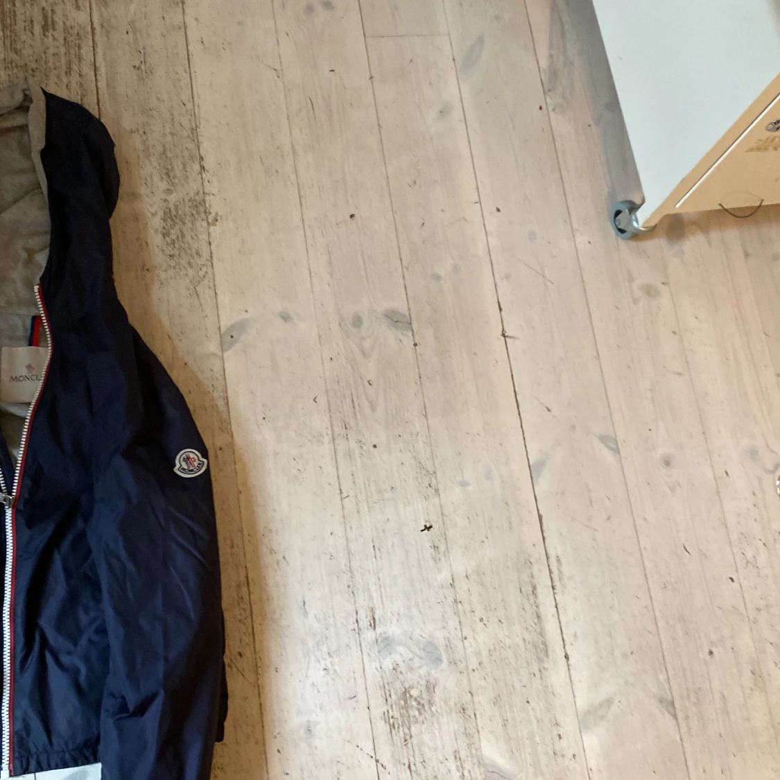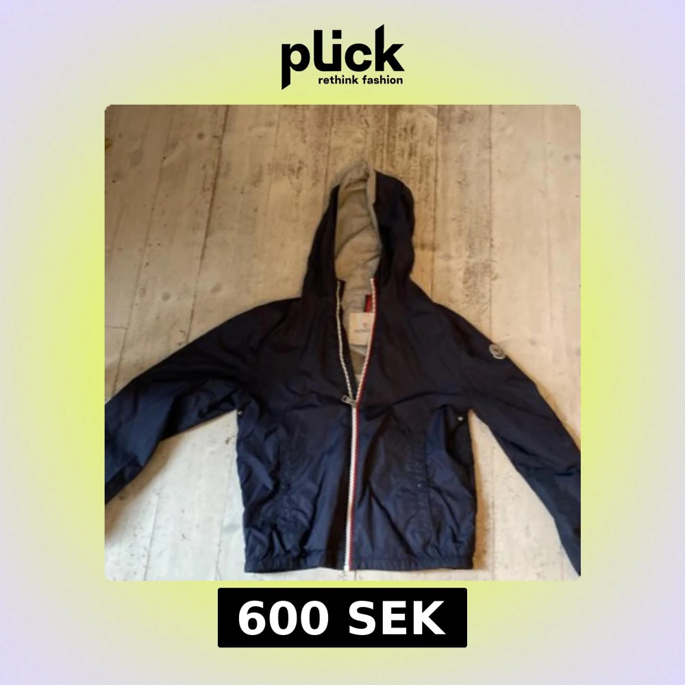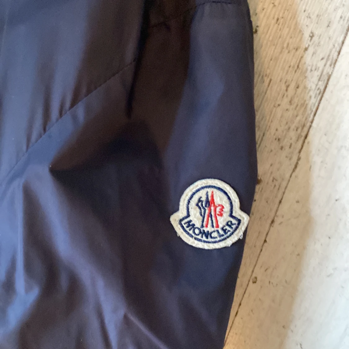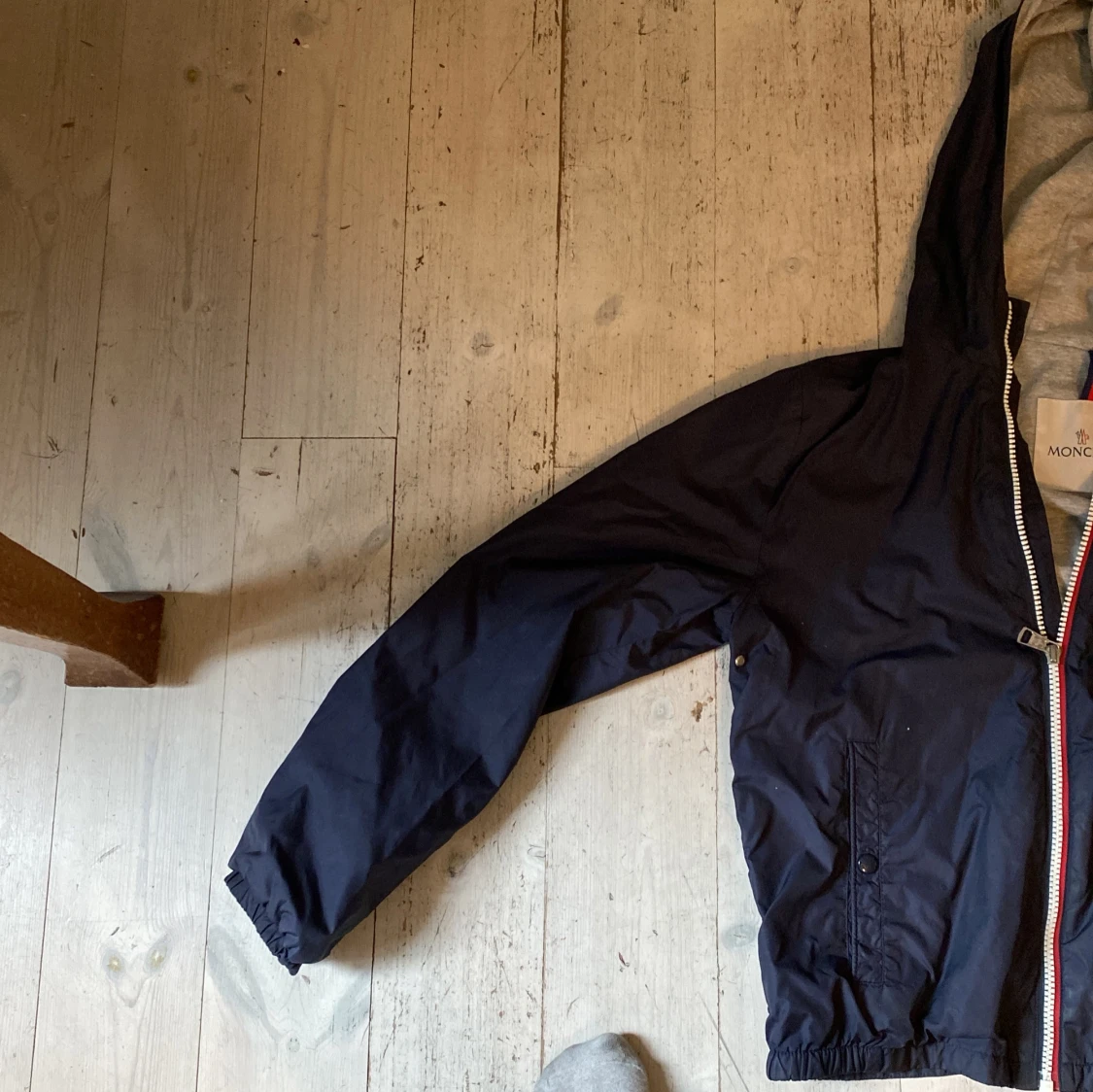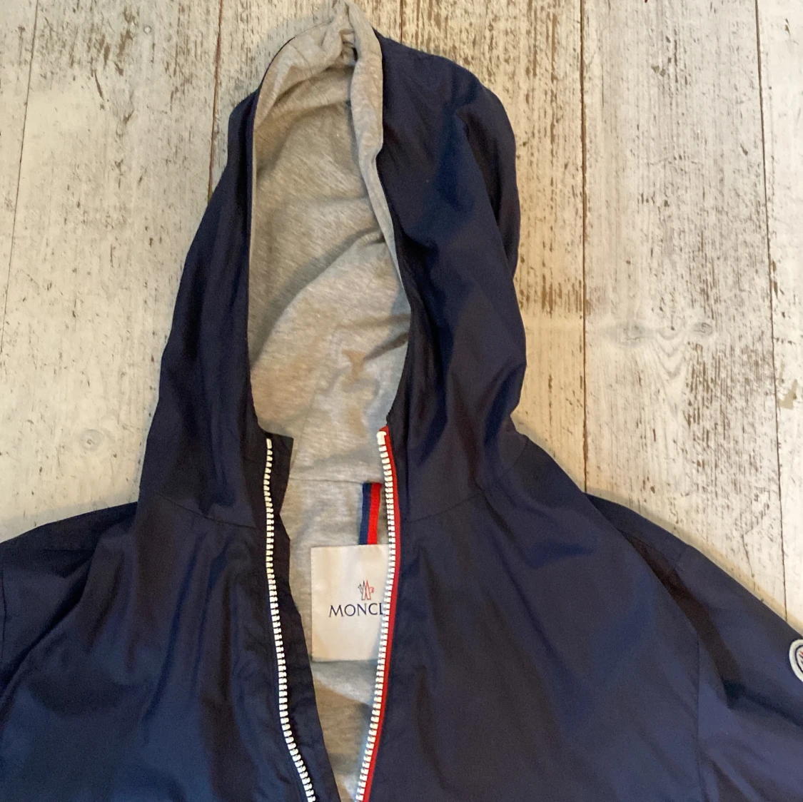 Säljer en snygg mörkblå vindjacka från Moncler med huva och dragkedja. Jackan har långa ärmar och en broderad logotyp på ärmen. Perfekt för blåsiga dagar! Andledning att jag säljer är att jag växt ur den. Och den är perfekt nu till våren då den är rätt så tunn.