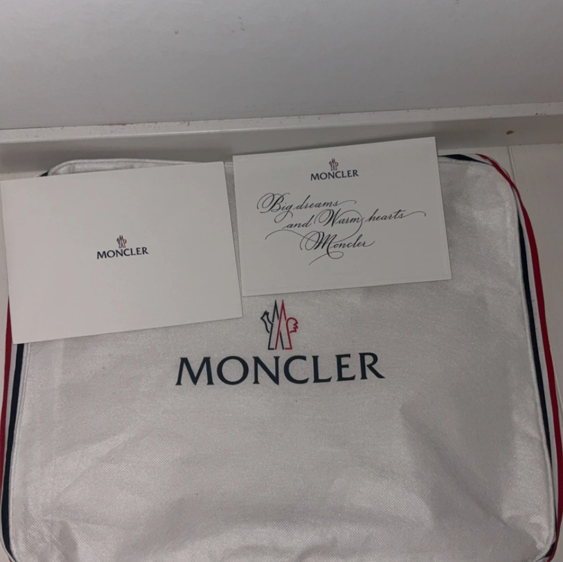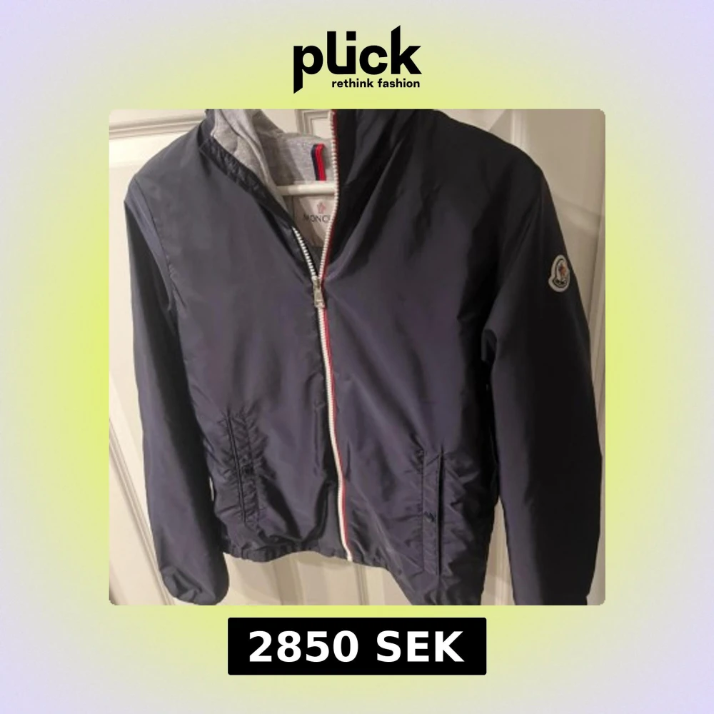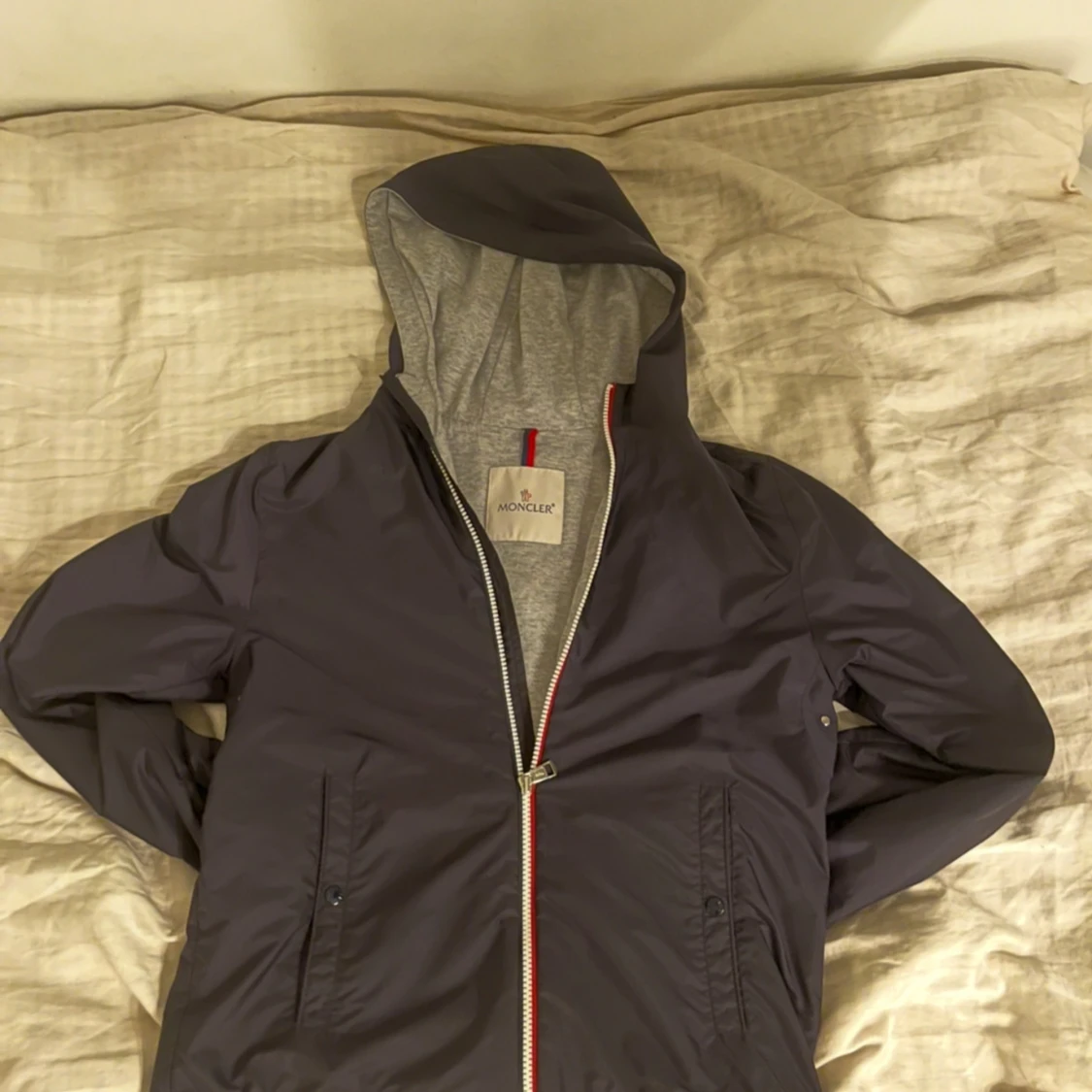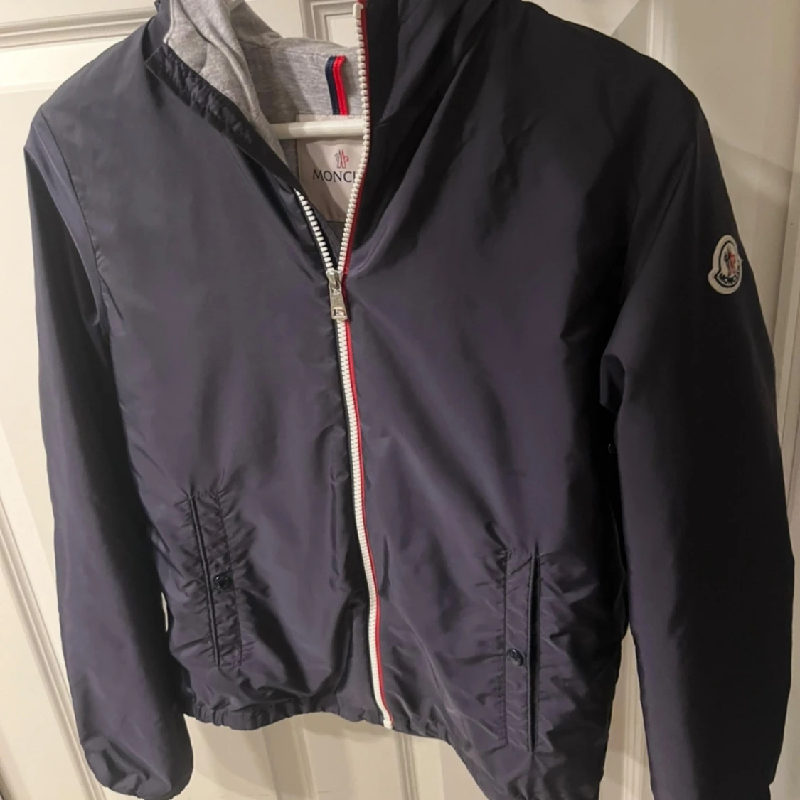 Snygg mörkblå vindjacka från Moncler med grå huva och vit dragkedja med röd och blå detalj. Jackan har två fickor med knappar och klassisk Moncler-logga på ärmen. Perfekt för vår och höst, tillverkad i polyester och har en sportig vibe. Den är köpt från monclears hemsida och är knappt använd.😁