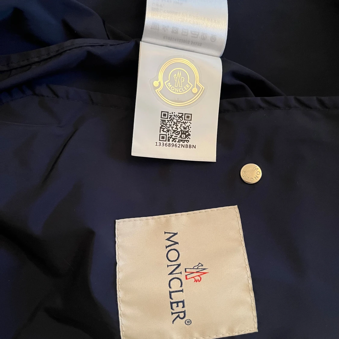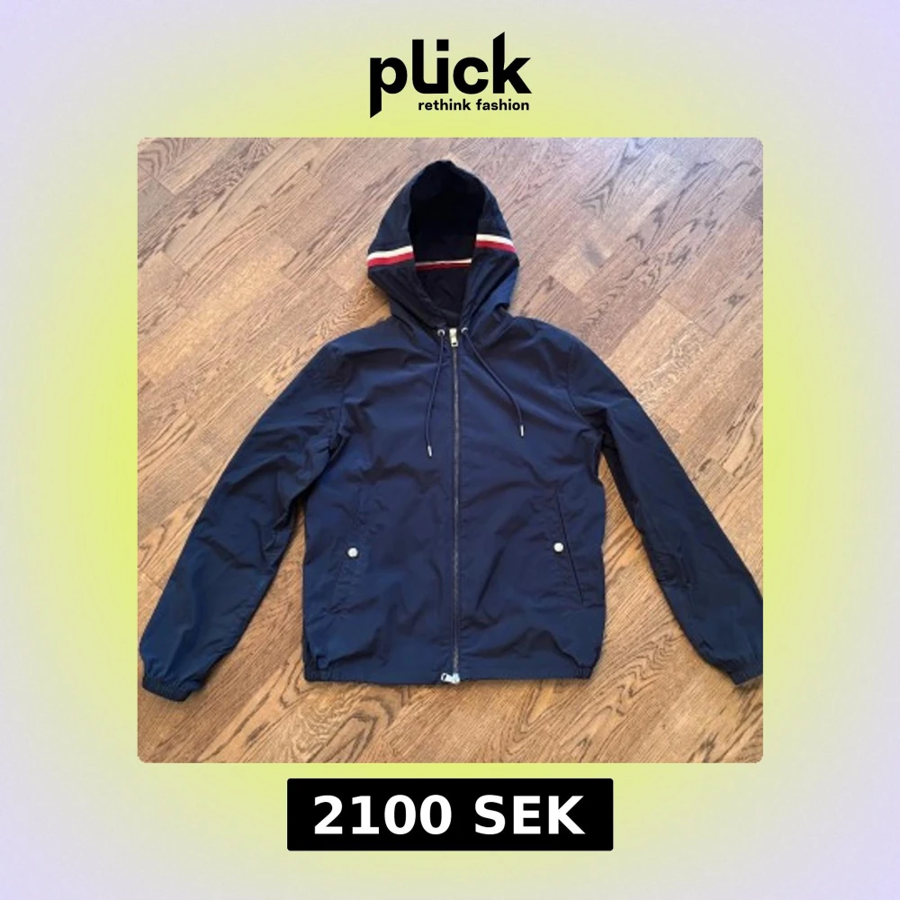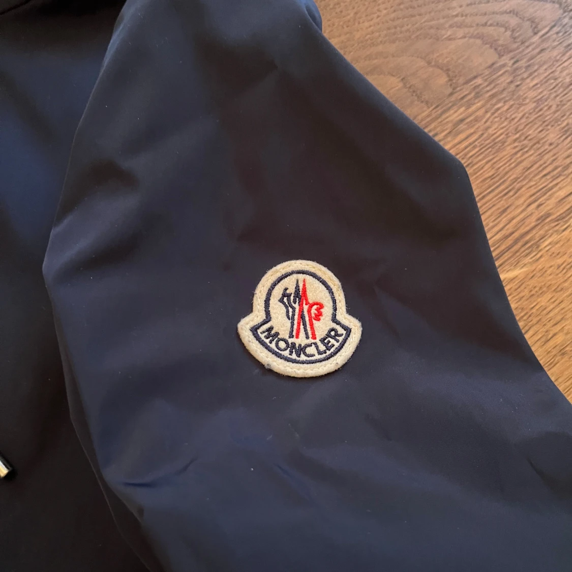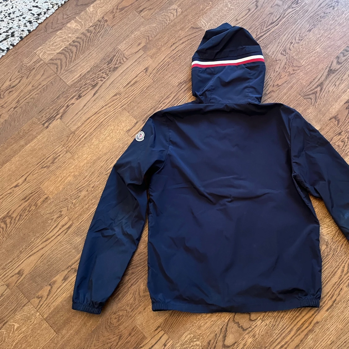 Snygg mörkblå vindjacka från Moncler med huva och dragkedja. Jackan har Moncler-logga på ärmen, två fickor med tryckknappar och elastiska muddar. Huvan har en röd och vit randig detalj som ger en sportig vibe. Perfekt för dig som gillar stilrena och exklusiva plagg. Stl 1 motsvarar S