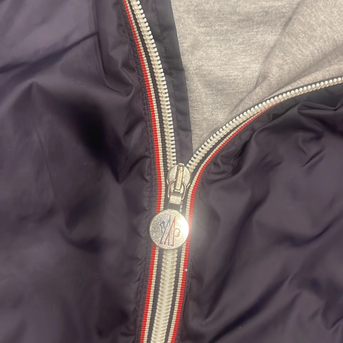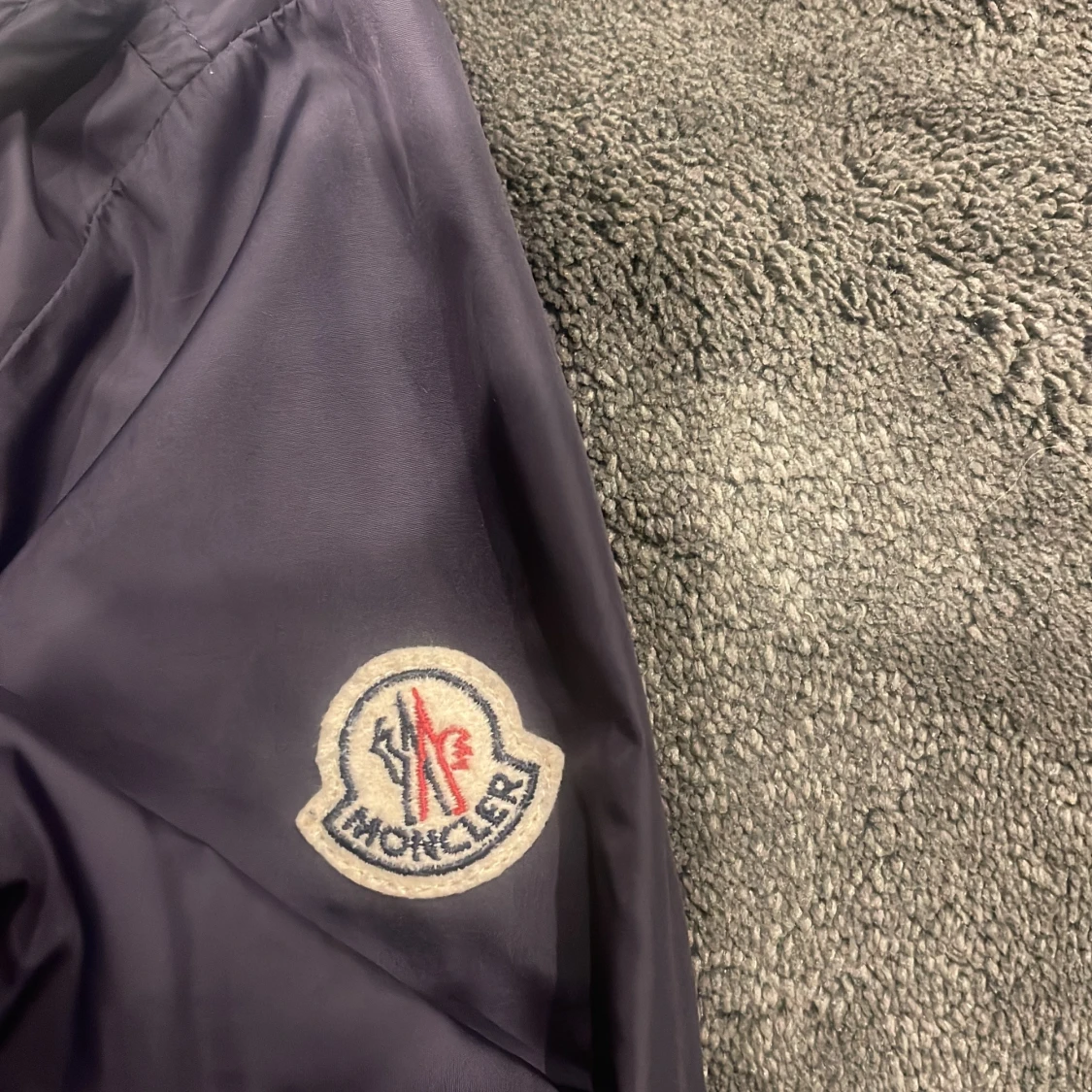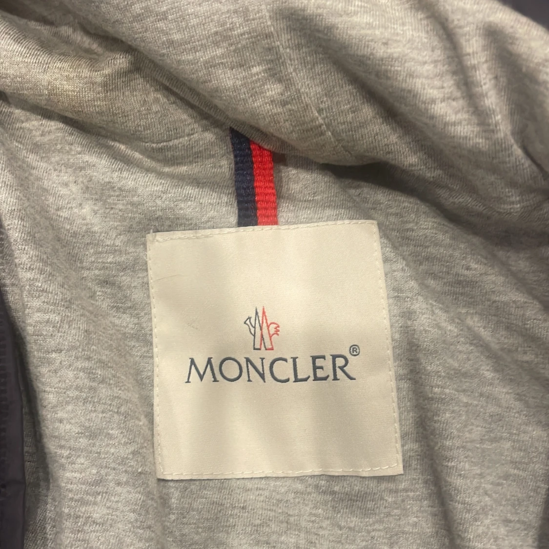 Snygg mörkblå vindjacka från Moncler med huva och dragkedja i regnbågsfärger. Jackan har ett broderat Moncler-märke på ärmen och en grå insida. Perfekt för blåsiga dagar! Det är dock ett litet hål innanför som man inte märker. Äkta ✅