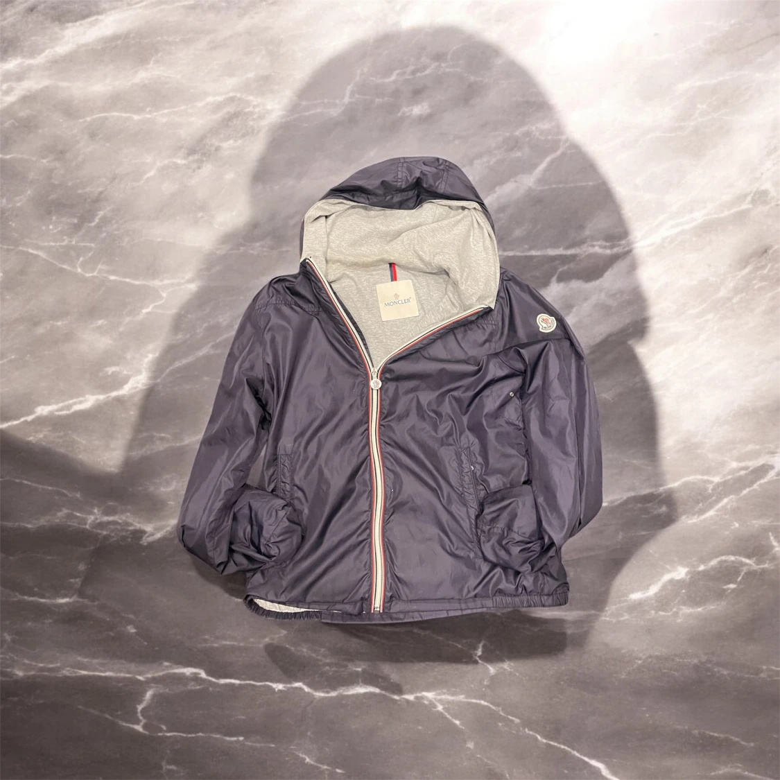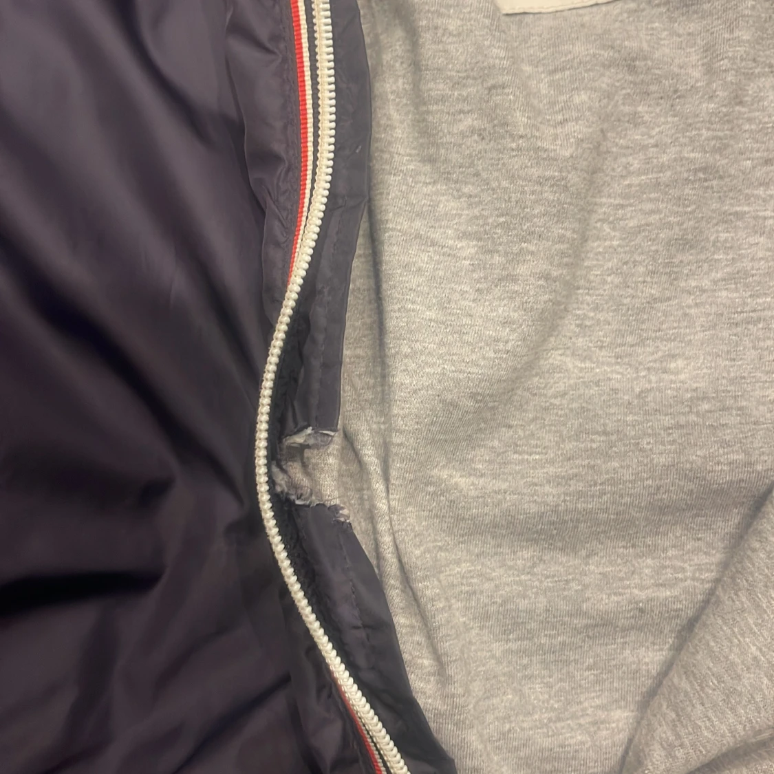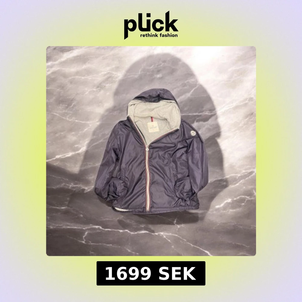 Snygg mörkblå vindjacka från Moncler med huva och dragkedja i regnbågsfärger. Jackan har ett broderat Moncler-märke på ärmen och en grå insida. Perfekt för blåsiga dagar! Det är dock ett litet hål innanför som man inte märker. Äkta ✅