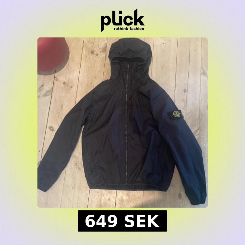 Snygg svart vindjacka från Stone Island med huva och dragkedja framtill. Jackan har en ikonisk logga på ärmen och är perfekt för blåsiga dagar. Den är lätt och smidig att bära med sig.