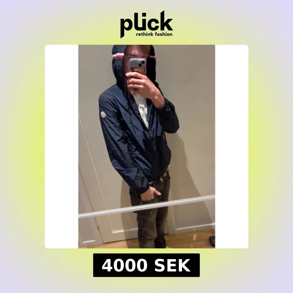 en snygg mörkblå vindjacka från Moncler med huva och dragkedja. Jackan har Moncler-logga på ärmen och röd-vit randdetalj på huvan. Perfekt för blåsiga dagar och det varmare vädret som nalkas!