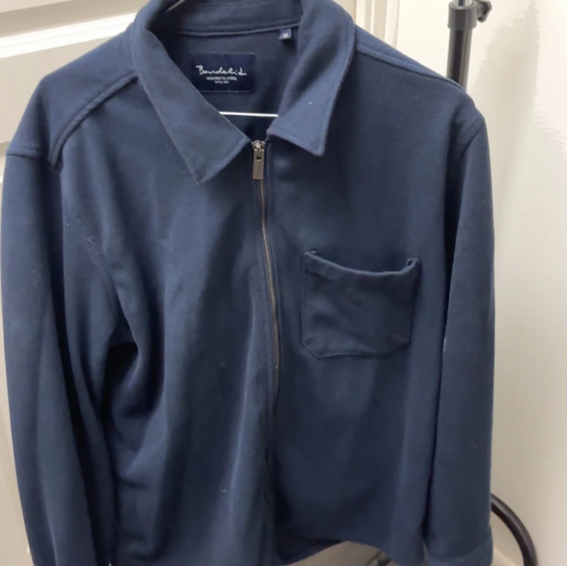 Säljer en mörkblå jacka från Brandalised med dragkedja framtill och en bröstficka. Jackan har klassisk krage och lång ärm, perfekt för lager-på-lager. Enkel och stilren design som funkar till det mesta.