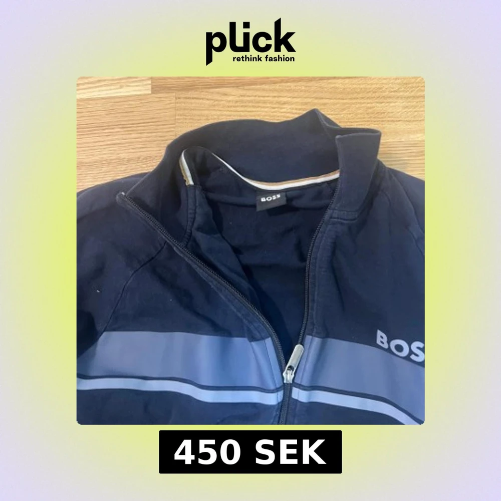 Mörkblå jacka från BOSS med hel dragkedja och ståkrage. Jackan har två fickor framtill och en bred, ljusblå rand över bröstet med en tunnare rand under. Perfekt för en chill och sportig look.