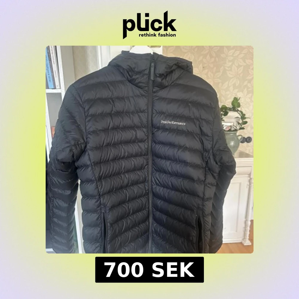 Mörblå dunjacka från Peak Performance med huva och dragkedja framtill. Den är använd men i väldigt fint skick.