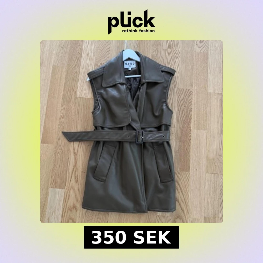Snygg mörkbrun skinnväst från NA-KD med bred krage och bälte i midjan. Västen har två framfickor och en stilren, rak passform.