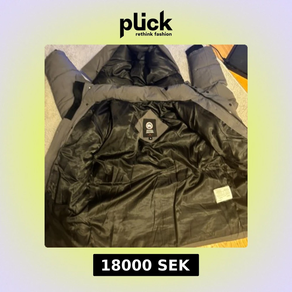 Säljer en mörkgrå dunjacka från Canada Goose med huva och klassisk logga på insidan. Jackan har quiltad design, lång ärm och dragkedja framtill. Insidan är fodrad med svart, glansigt material och jackan är perfekt för kalla vinterdagar.