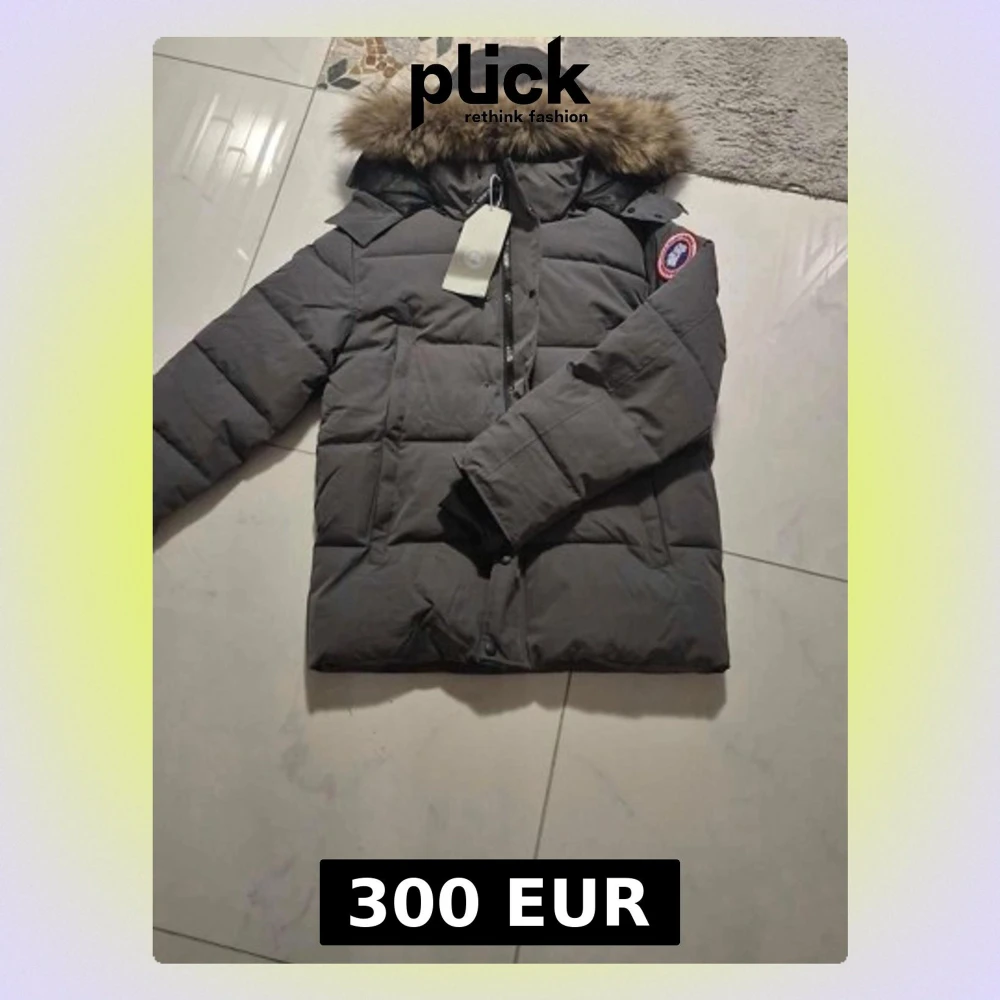 Säljer en mörkgrå dunjacka från Canada Goose med pälskantad huva och klassisk logga på ärmen. Jackan har långärmade quiltade partier, dragkedja och knappar framtill. Insidan är fodrad med svart satin för extra komfort och värme.