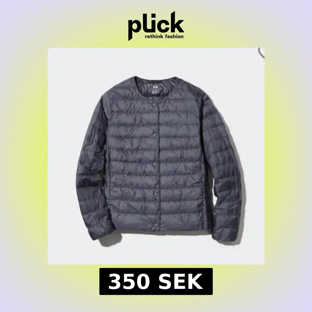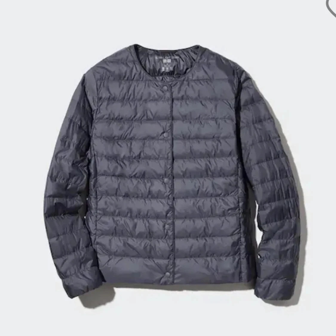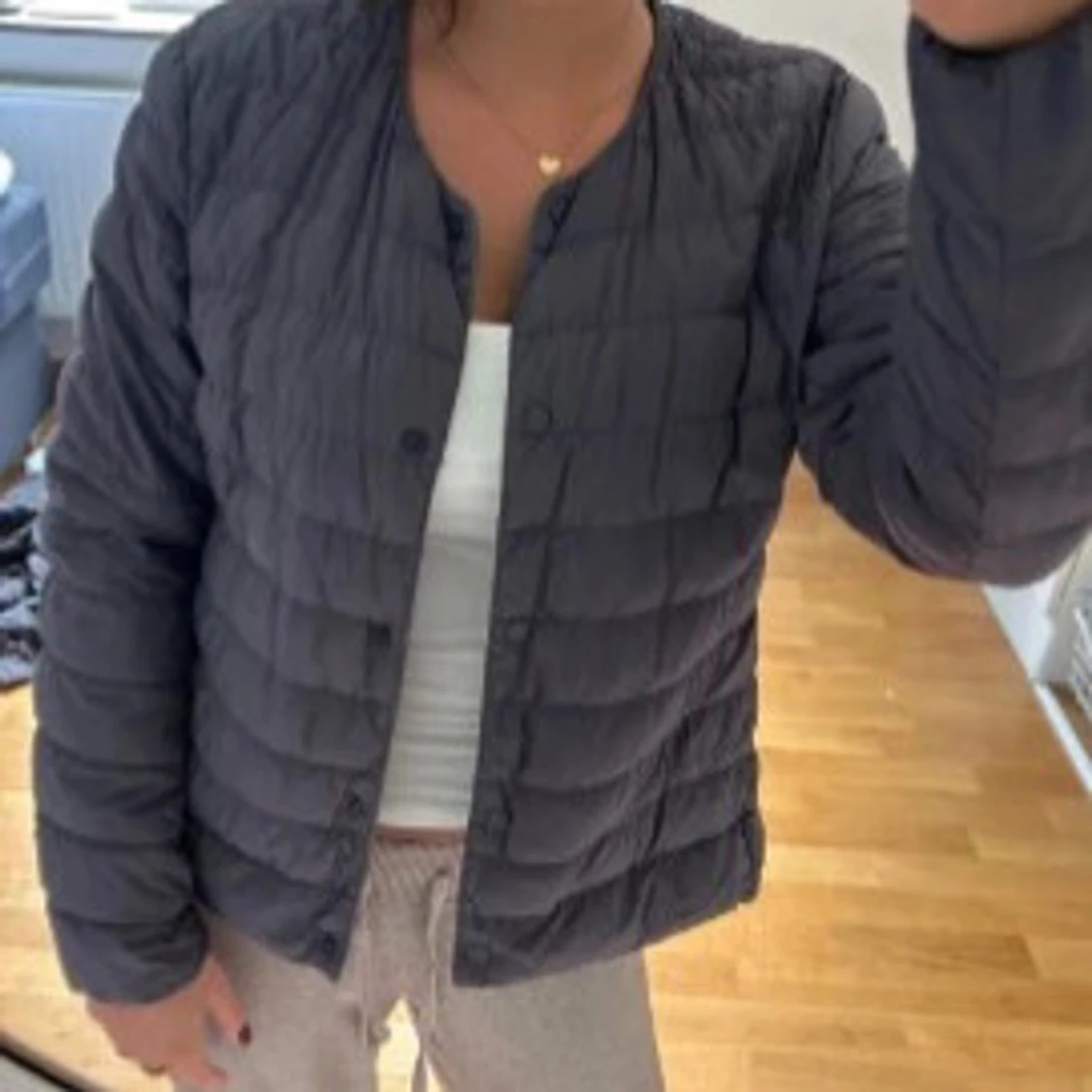 Säljer en stilren mörkgrå dunjacka från Uniqlo med rund hals och knappar framtill. Jackan är lätt, quiltad och har en clean look utan krage. Perfekt att slänga på sig när det är kyligt ute. Bilden är lånad men min är bara använd en gång och ser som ny ut. Skriv om fler bilder önskas🩷🩷