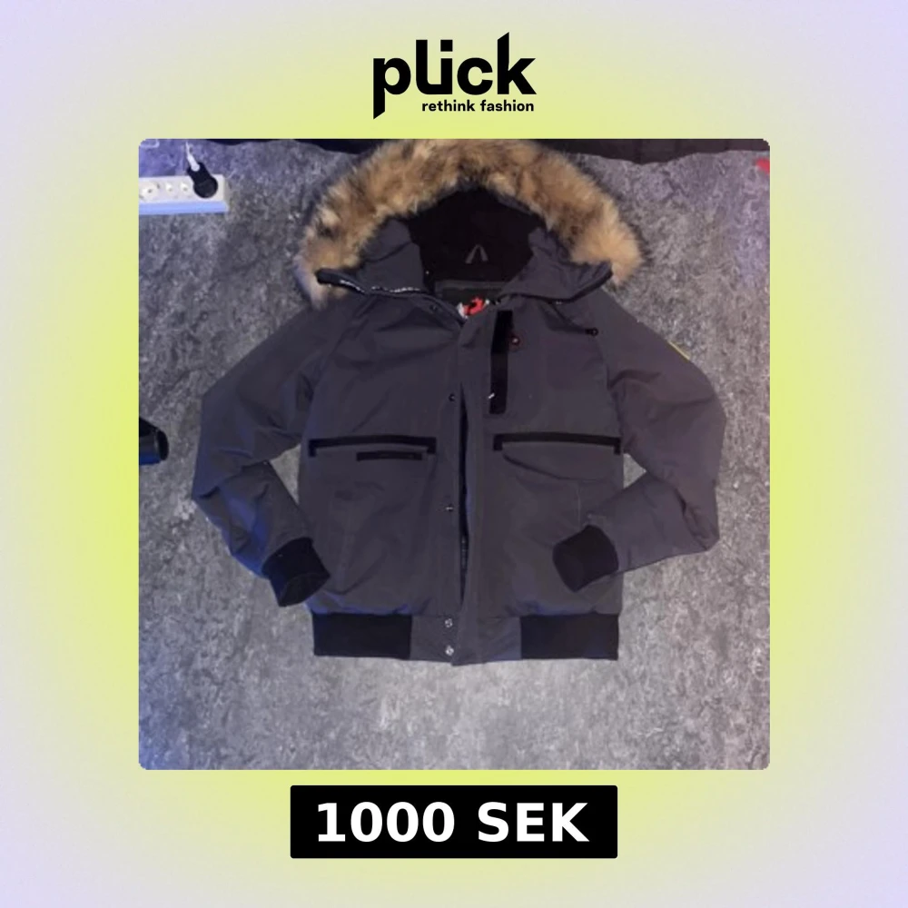 Säljer en mörkgrå dunjacka från Zavetti Canada med fluffig päls på huvan och snygga svarta detaljer. Jackan har flera fickor med dragkedja, ribbade muddar och ett broderat märke på ärmen. Perfekt för kalla vinterdagar och har en schysst, lite loose passform.
