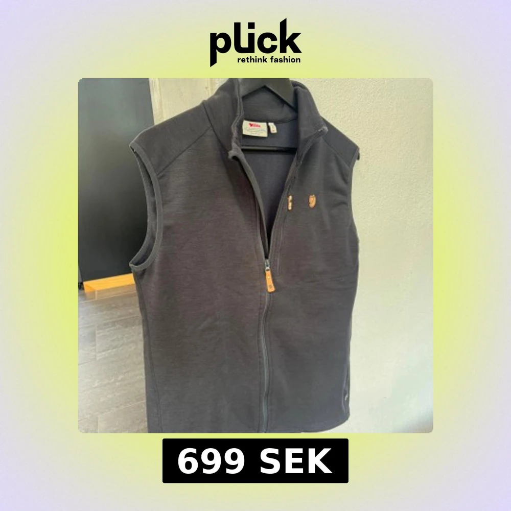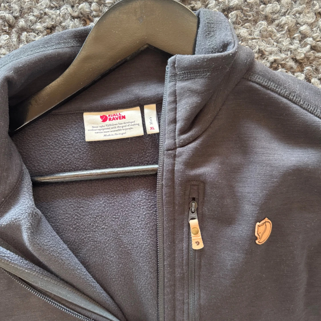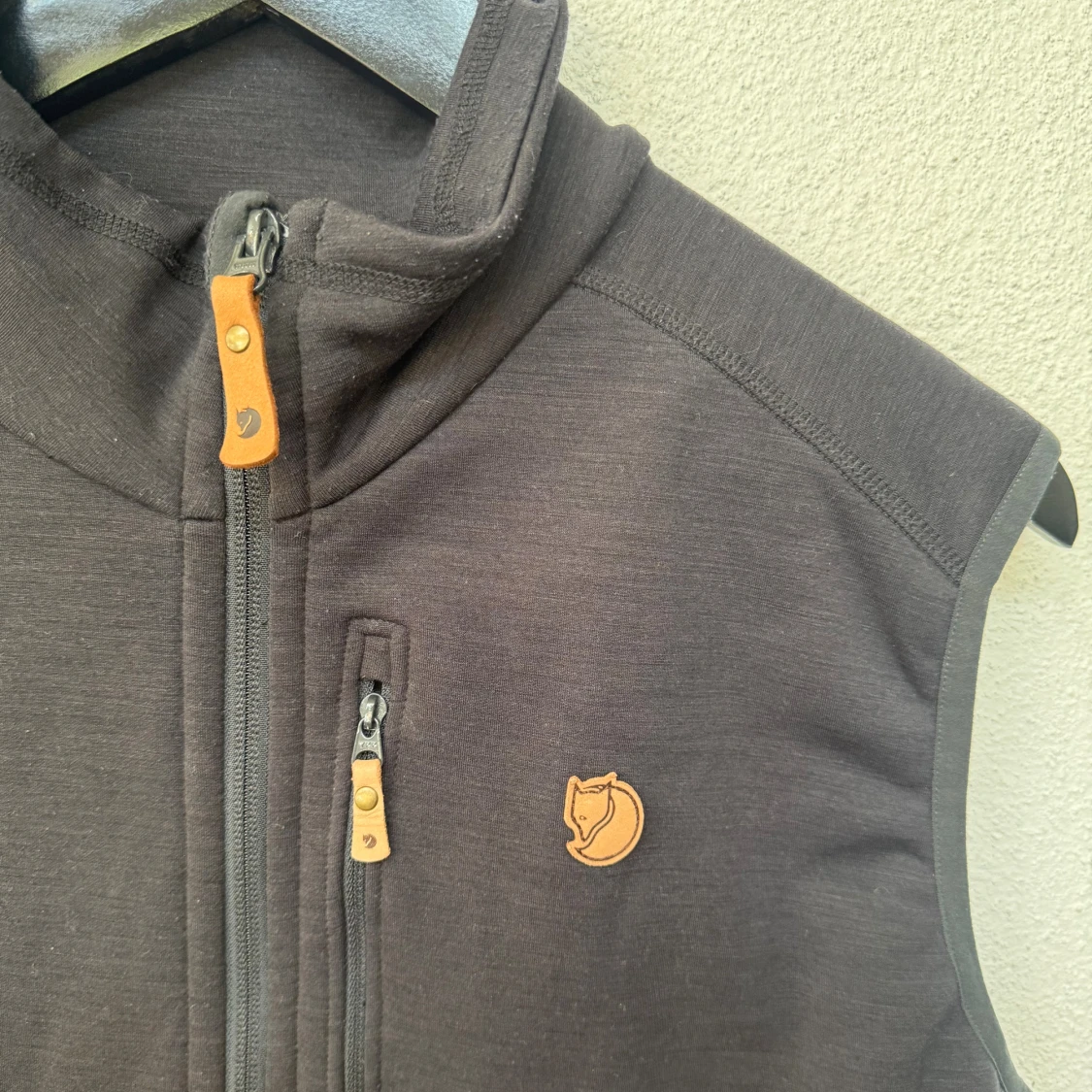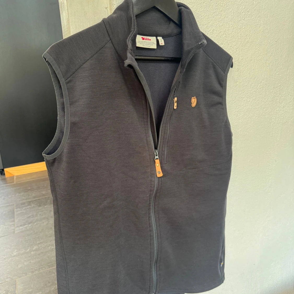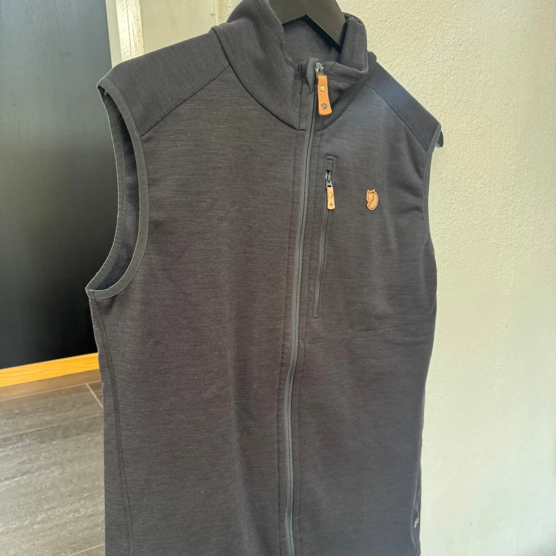 Riktigt snygg mörkgrå ullväst från Fjällräven i mjuk fleece på insidan med hel dragkedja och krage. Västen har en bröstficka med dragkedja och klassisk Fjällräven-logga på bröstet med beiga detaljer. Den är i myxket bra skick och perfekt till lager-på-lager-plagg för både uppklädda tillfällen men även till mer casual tillfällen. Den kombinerar stil och funktion väldigt bra med både ett värmande matrial som också är väldigt stilrent. Ordinarie pris var 1400