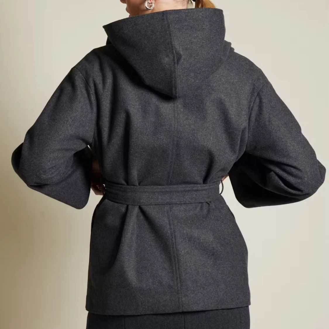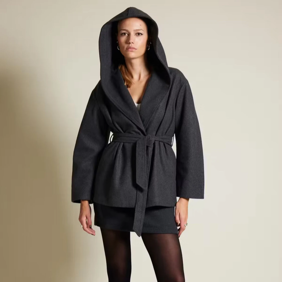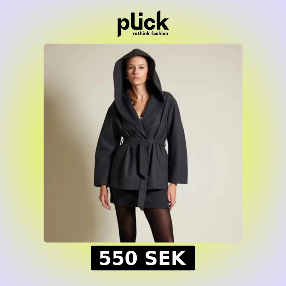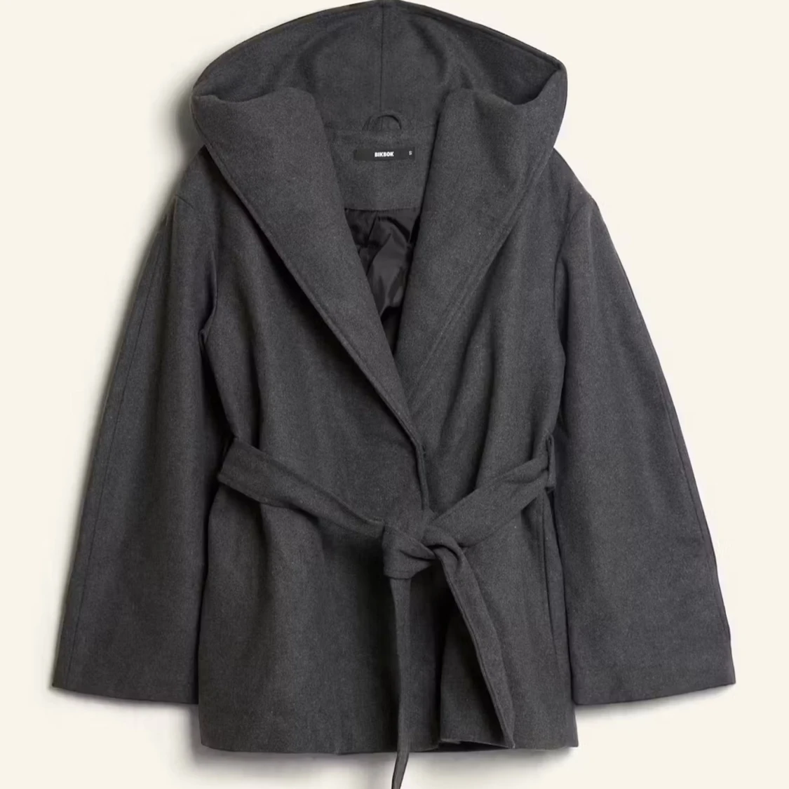 Mörkgrå kappa med stor huva och knytskärp i midjan från Bikbok. Jackan har en rak, loose passform och är tillverkad i ullmix. Perfekt för dig som gillar en stilren look med extra edge tack vare huvan.