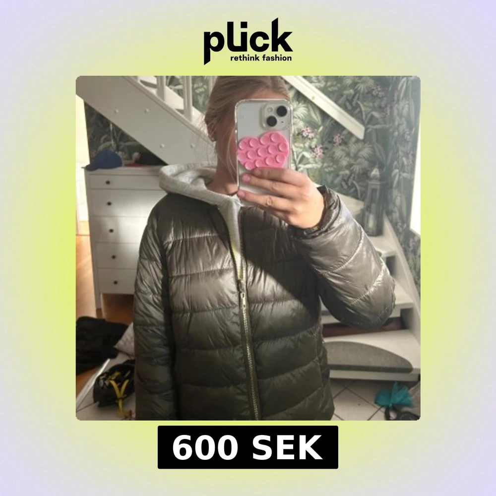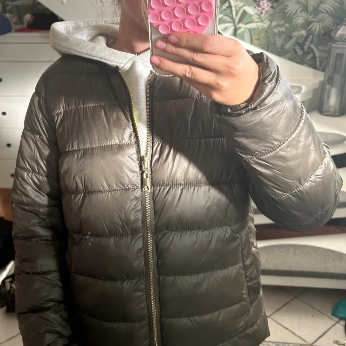 Säljer en stilren mörkgrå pufferjacka med horisontella quiltade sektioner och hel dragkedja framtill. Jackan har en klassisk, normal passform och är tillverkad i syntetmaterial som ger en lätt och skön känsla. Perfekt för kyliga dagar och enkel att matcha med din hoodie. Använd fåtal gånger. Köpt för 1200