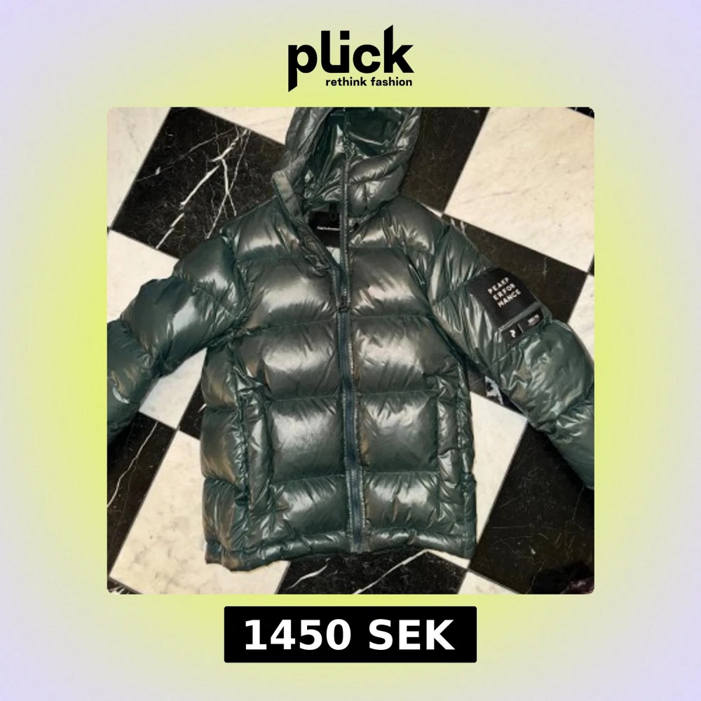 Snygg mörkgrön pufferjacka från Peak Performance med huva och stor patch på ärmen. Jackan har en glansig finish, dragkedja framtill och två stora fickor. Perfekt för kalla dagar och har en modern, boxig passform. Mycket bra skick!