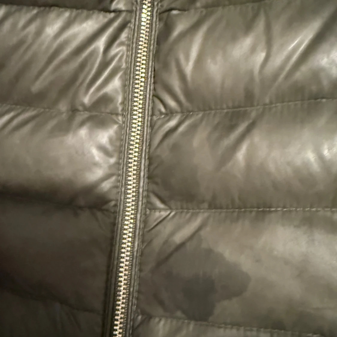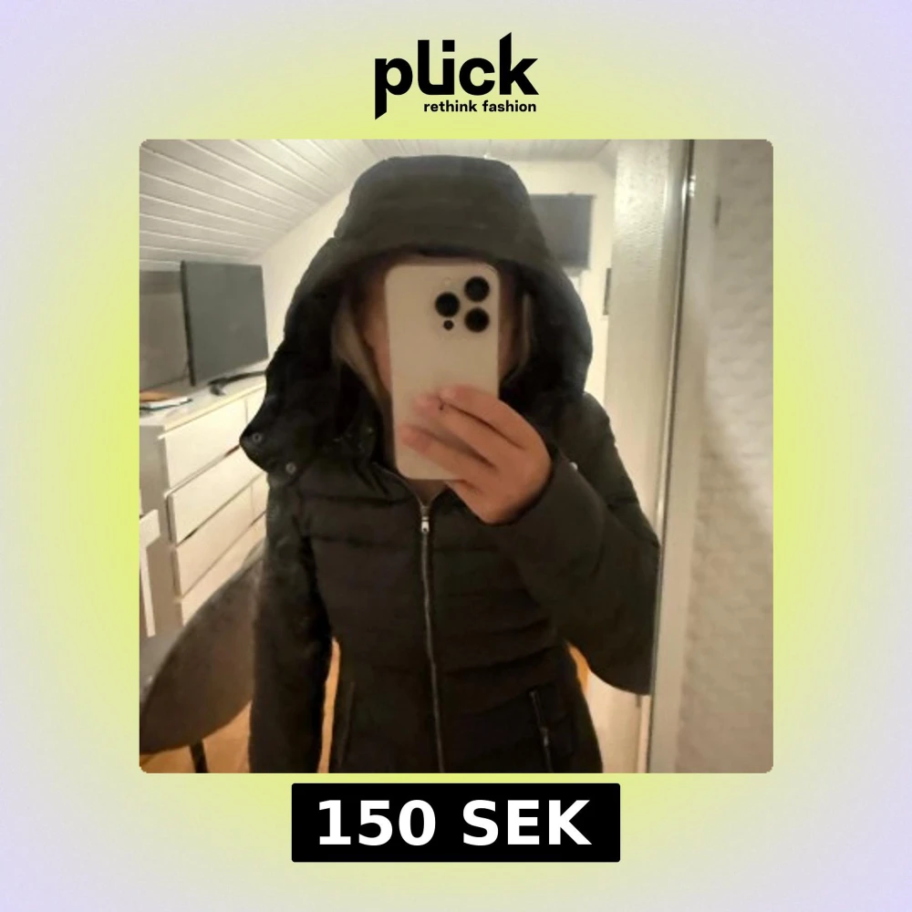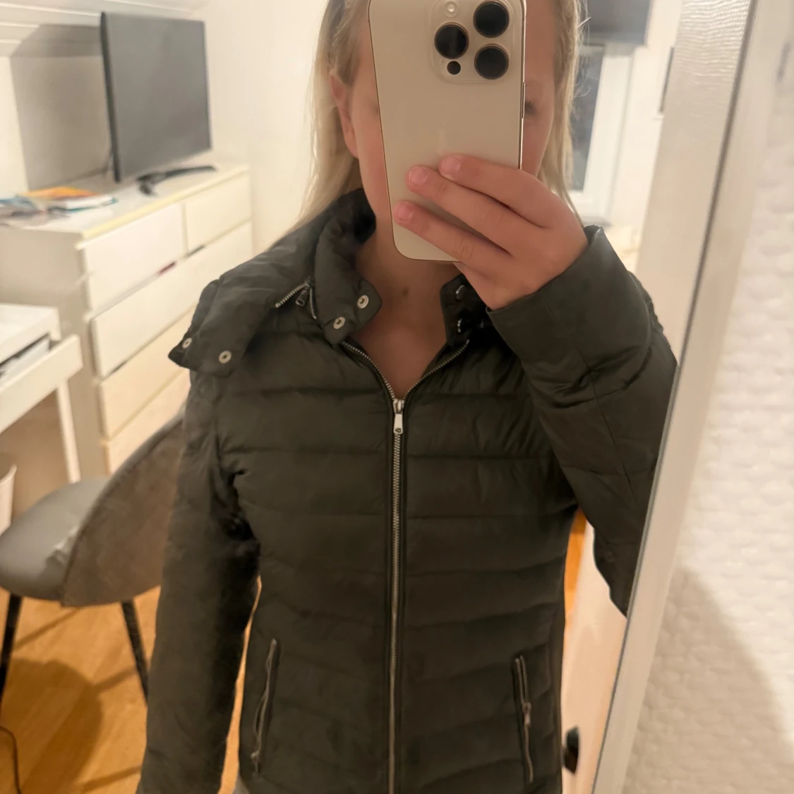 Säljer en mörkgrön pufferjacka med avtagbar huva och dragkedja framtill. Jackan har två fickor med dragkedja och quiltad design. En fläck på frammsidan men syns knappt. Andvänt få gånger