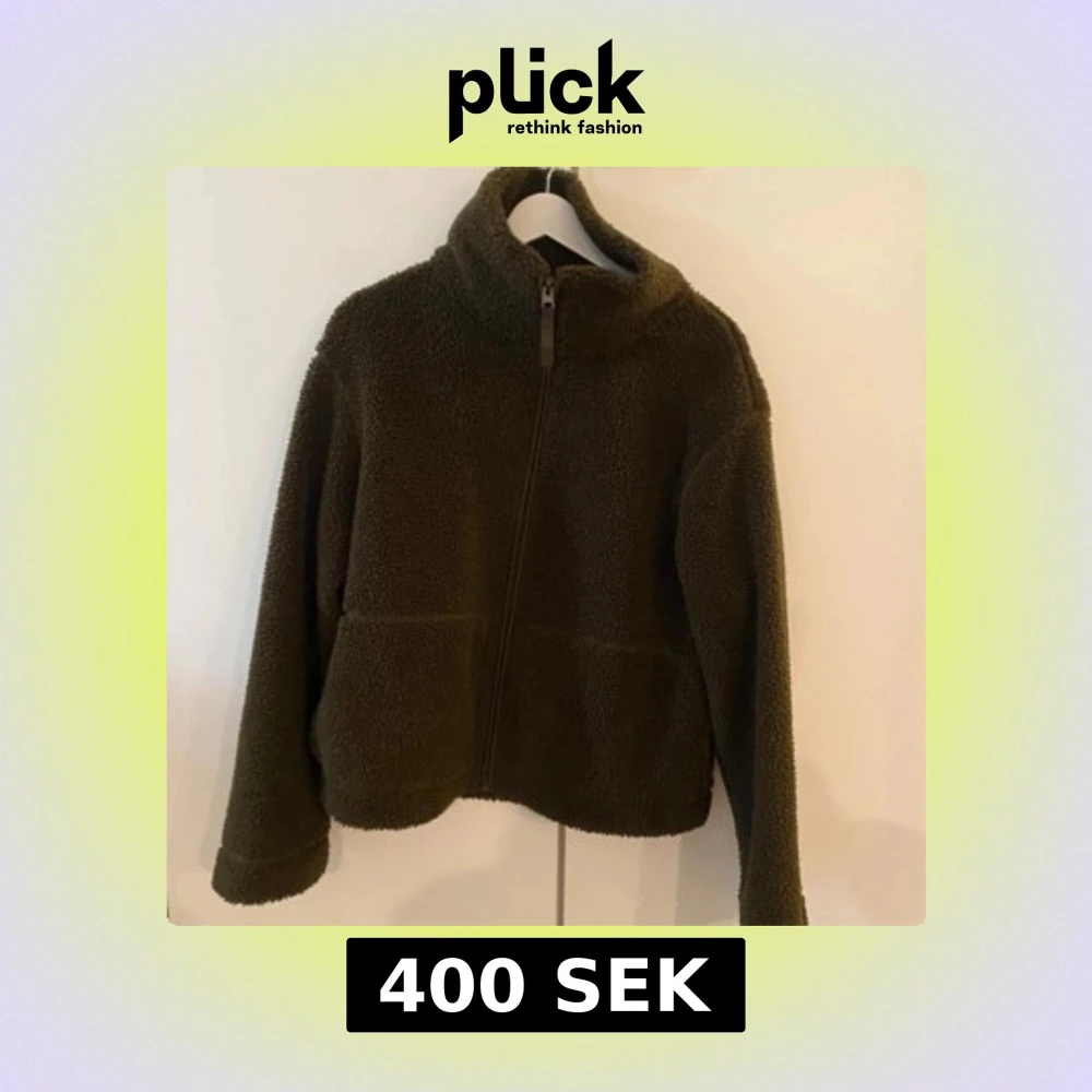 Mysig mörkgrön teddyjacka med hög krage och hel dragkedja framtill. Jackan har en loose passform och är tillverkad i mjuk fleece. Inga defekter. Färgen säljs inte längre på hemsidan.