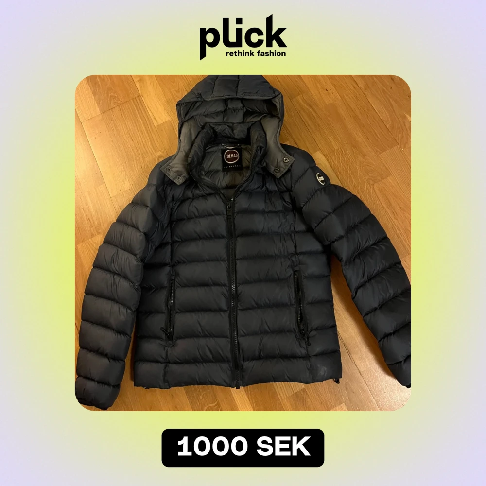 Säljer en snygg svart dunjacka från Colmar i mycket bra skick. Jackan har en dragkedja framtill och en mysig huva. Perfekt för kalla vinterdagar! Tyvärr en skada på insidan av armen på jackan. Som tur syns de inte då de är på insidan av armen.