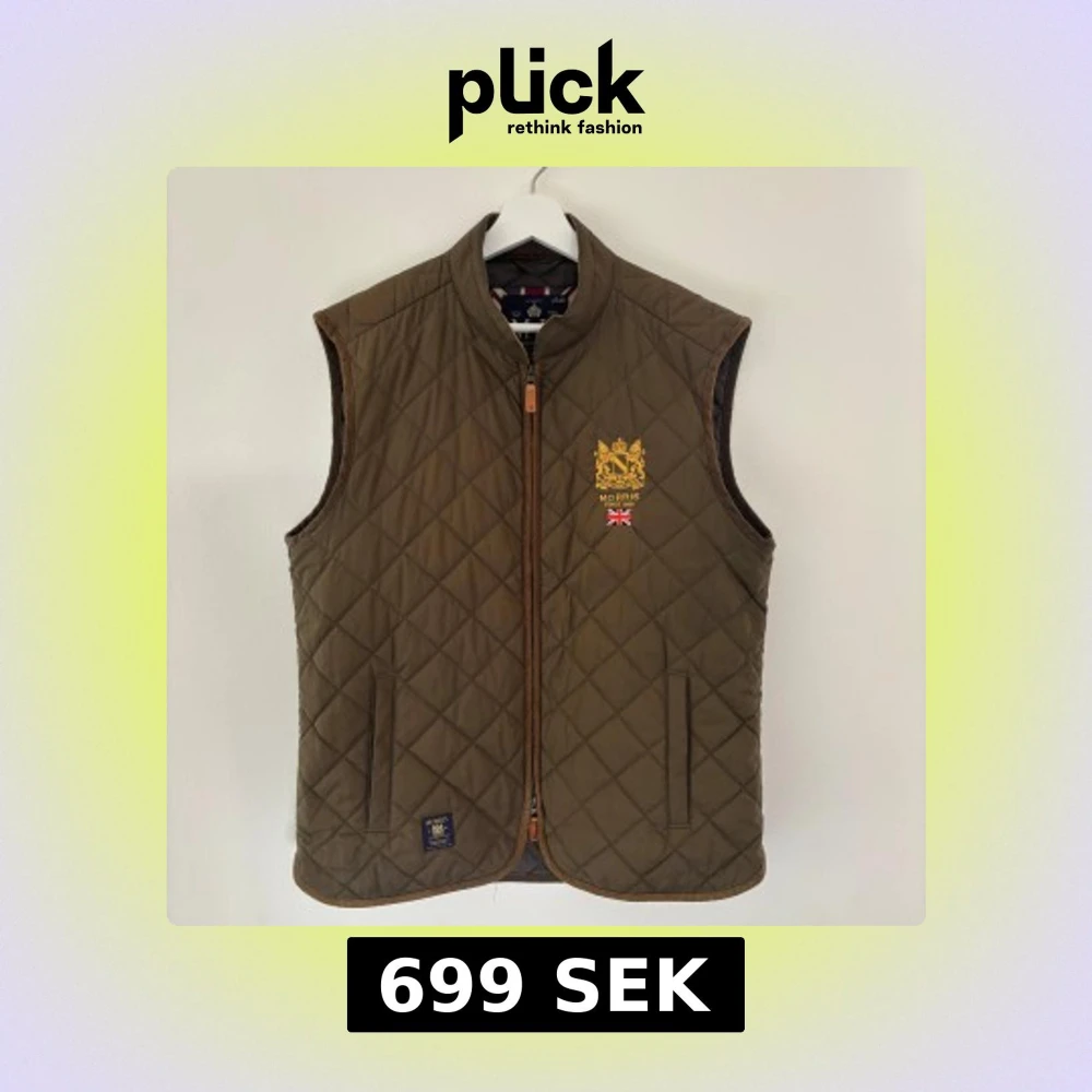 Snygg quiltad brun väst från Morris med guldbroderat emblem och brittisk flagga på bröstet. Västen har dragkedja framtill, två fickor och klassisk krage. Perfekt för lager-på-lager och ger en preppy vibe till din outfit.