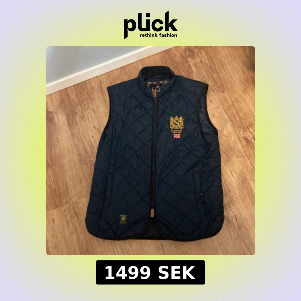 Snygg mörkblå quiltad dunväst från Morris med guldbroderat emblem och brittisk flagga på bröstet. Västen har dragkedja framtill och ståkrage. Perfekt för lager-på-lager och ger en klassisk brittisk vibe.