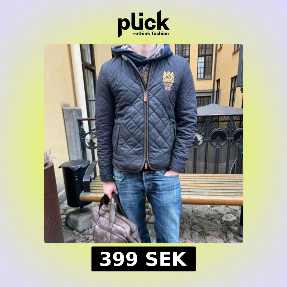 Säljer en snygg mörkblå quiltad jacka från Morris med broderad logga på bröstet. Jackan har dragkedja och långa ärmar, perfekt för höst och vår. Den har en stilren design med ribbade detaljer vid ärmslut och nederkant.