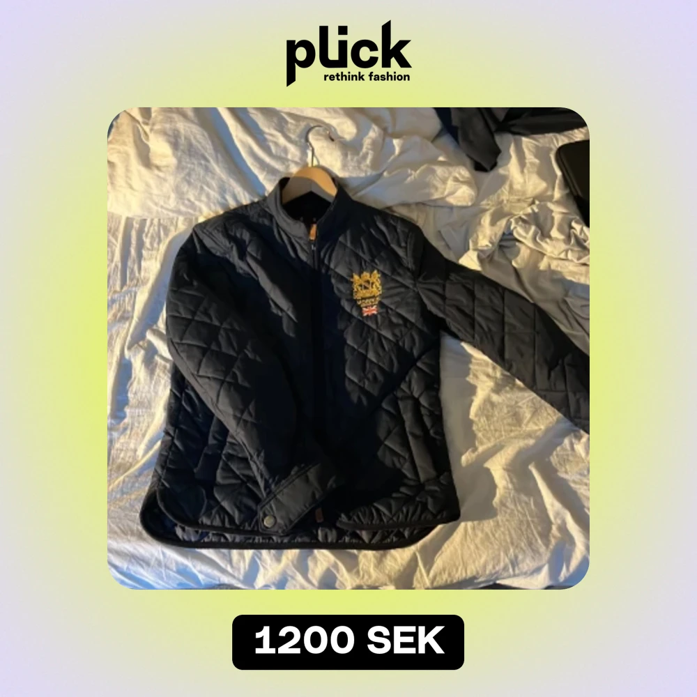 Säljer en snygg svart quiltad jacka från Morris. Den har ett broderat emblem på bröstet och en dragkedja framtill. Jackan är perfekt för höst och vår, med långa ärmar och en stilren design. Passar både till vardags och fest!