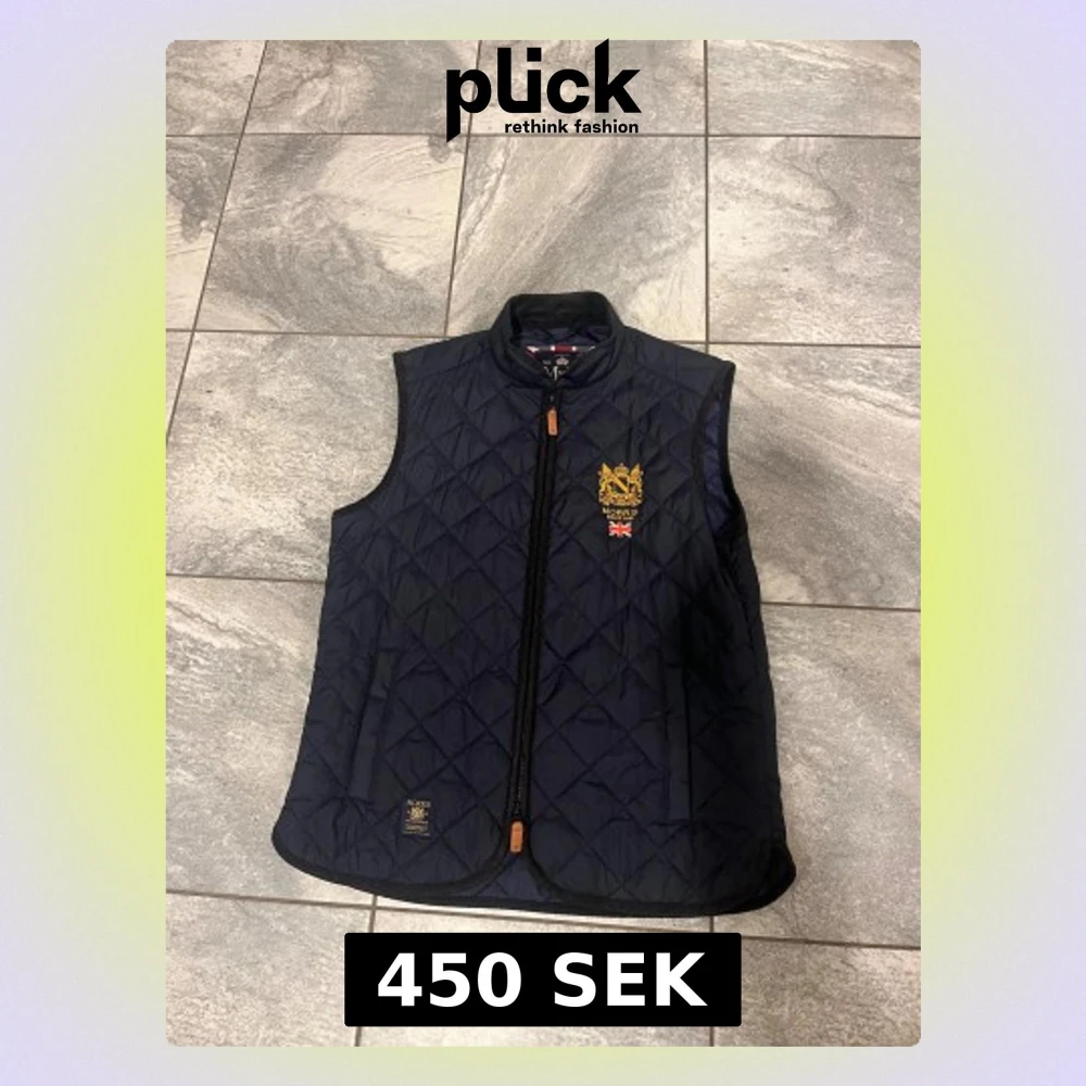 Quiltad mörkblå väst från Morris med gul broderad logga och brittisk flagga på bröstet. Västen har ståkrage i manchester, dragkedja med läderdetalj och två sidofickor. Perfekt för dig som gillar klassisk stil med snygga detaljer.