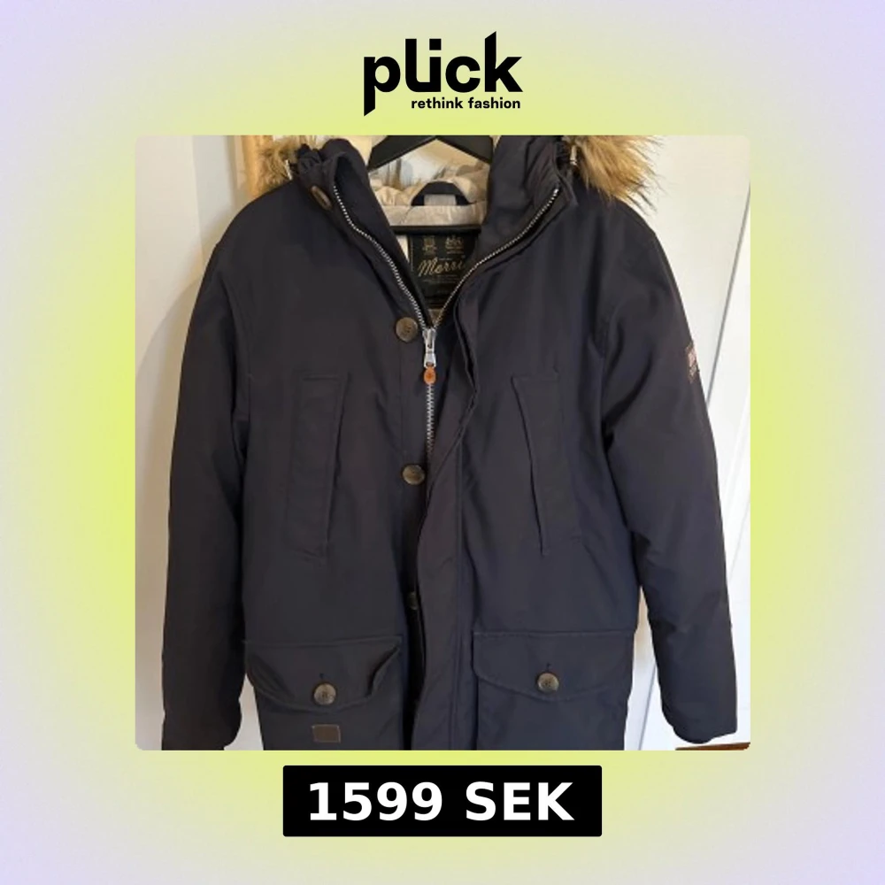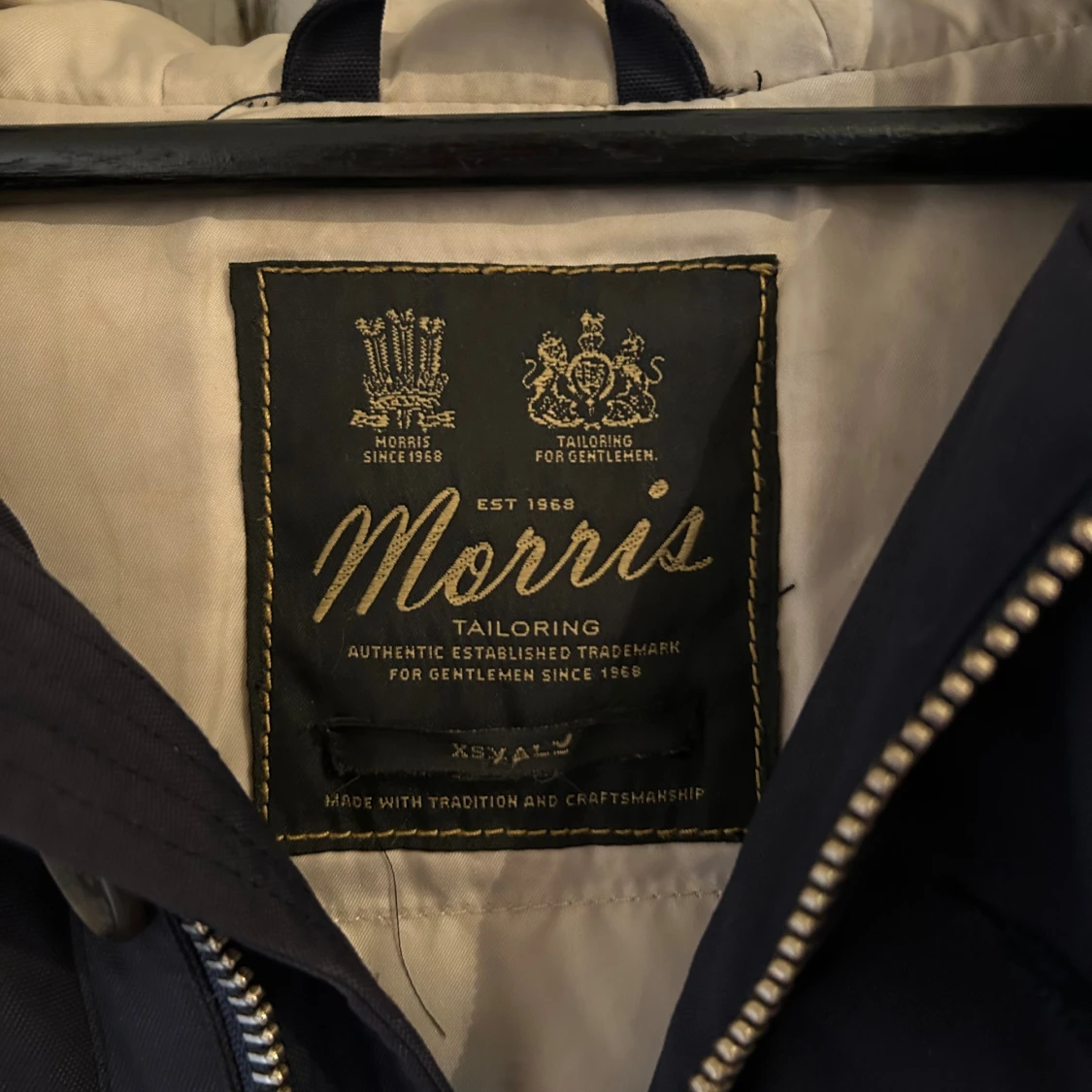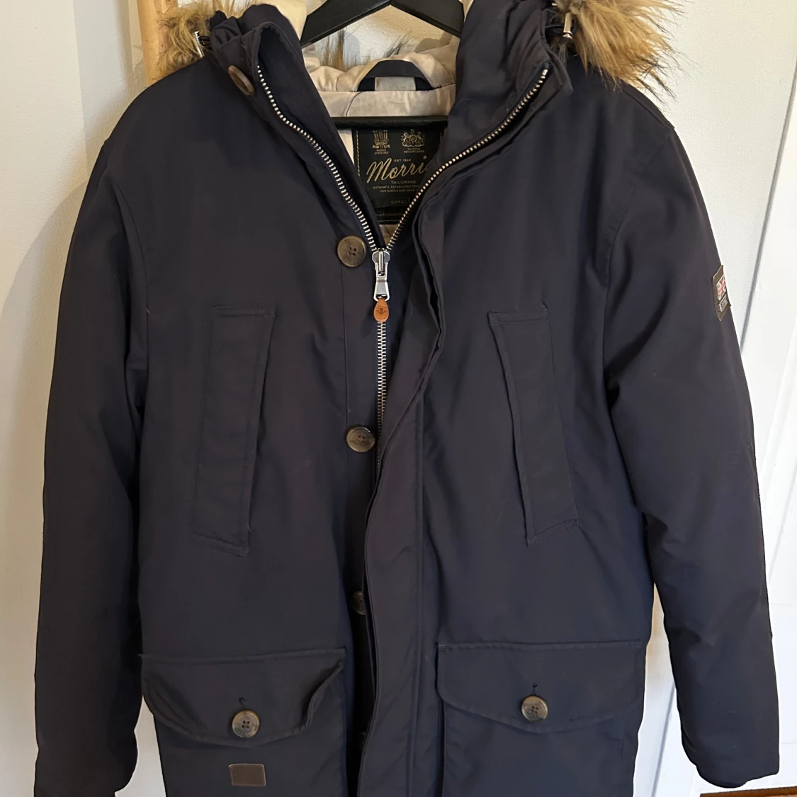Säljer en mörkblå parkajacka från Morris med snygg fuskpäls på huvan, dragkedja och knappar framtill samt flera praktiska fickor. Jackan har en klassisk patch på ärmen och är fodrad för extra värme. Perfekt för kyliga dagar!