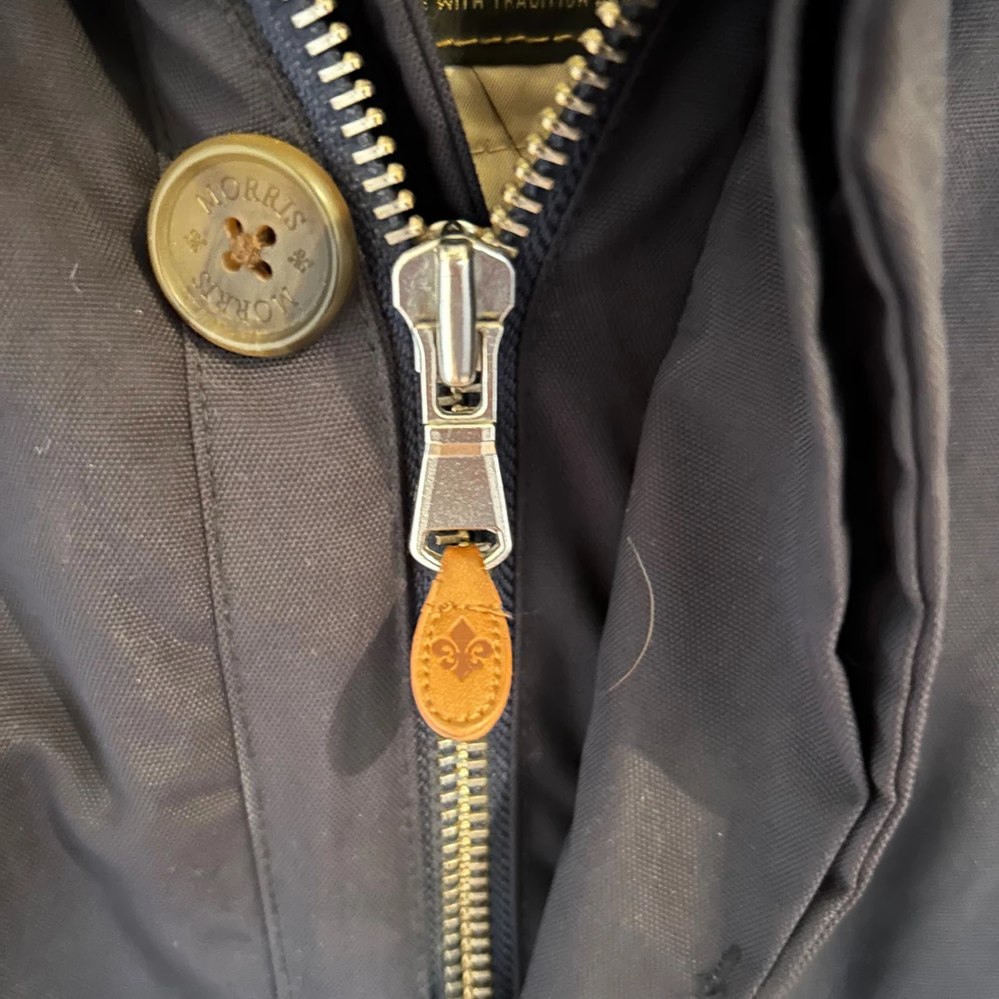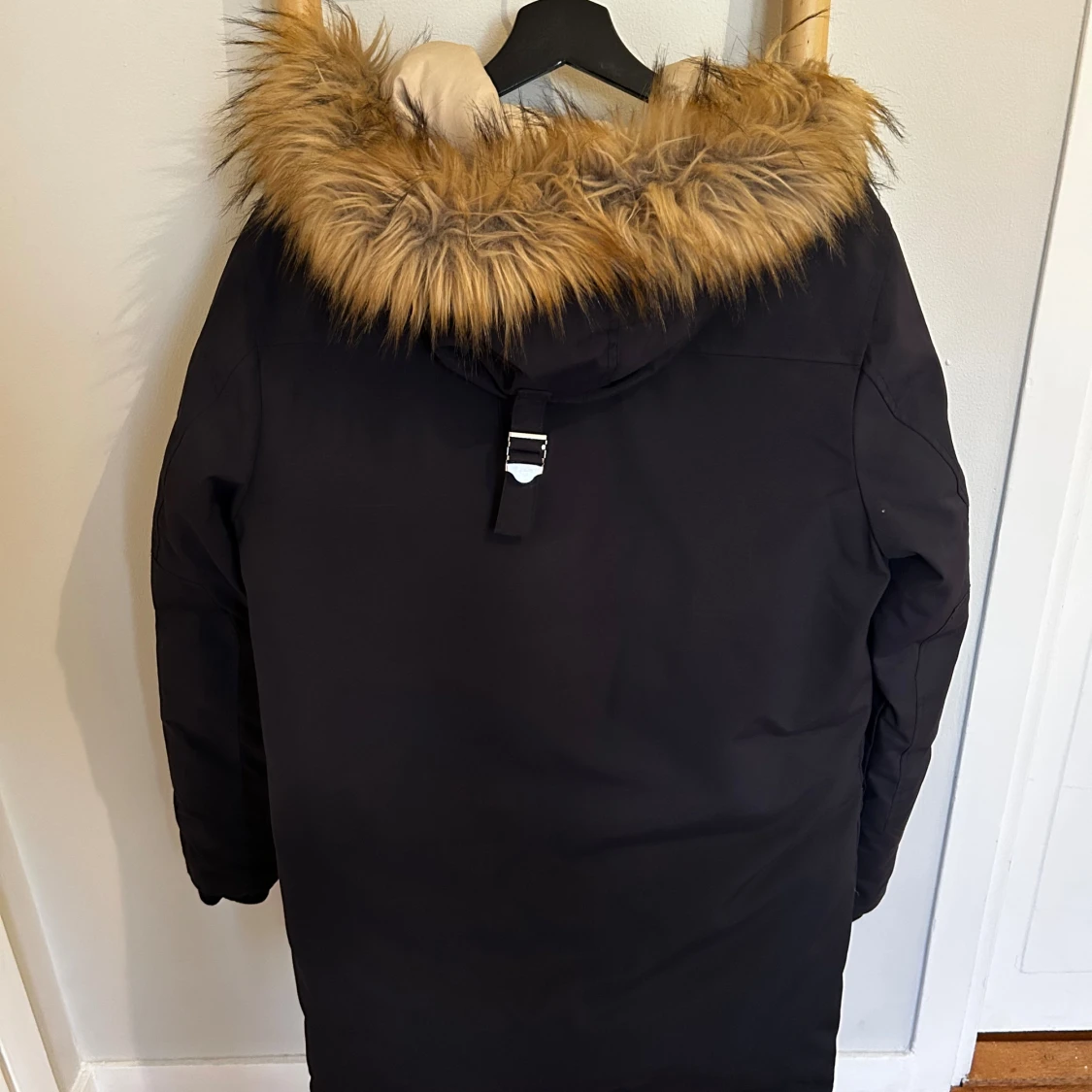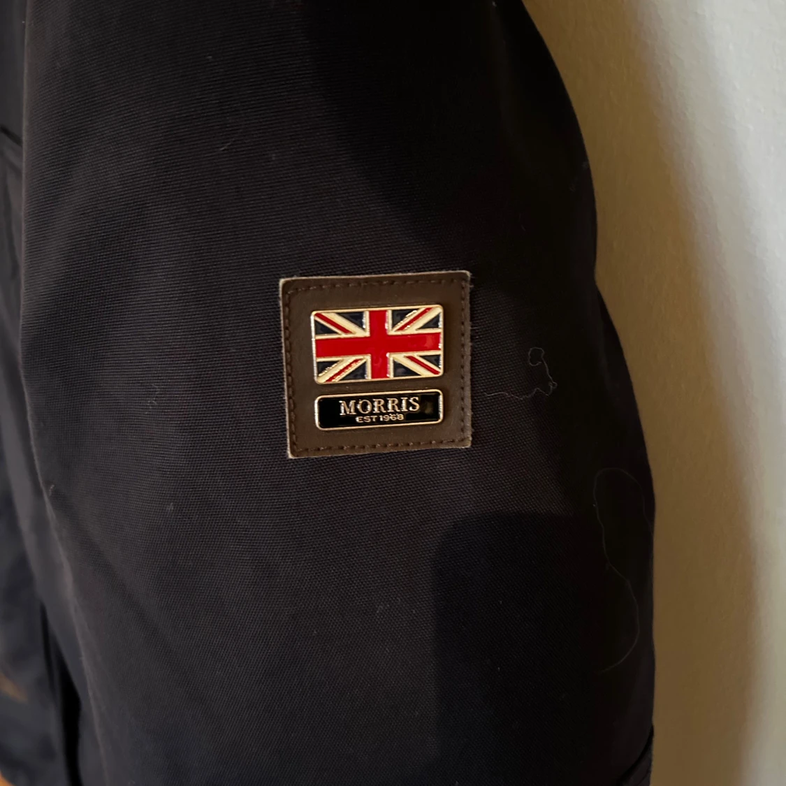 Säljer en mörkblå parkajacka från Morris med snygg fuskpäls på huvan, dragkedja och knappar framtill samt flera praktiska fickor. Jackan har en klassisk patch på ärmen och är fodrad för extra värme. Perfekt för kyliga dagar!