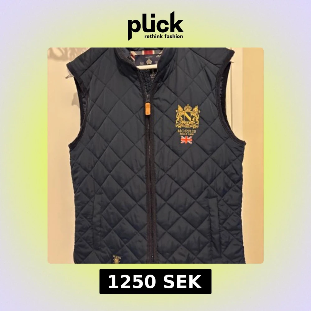 Nästan aldrig änvänd så är ny skick. Quiltad mörkblå dunväst från Morris med broderad gul logga och brittisk flagga på bröstet. Västen har dragkedja framtill, ståkrage och två fickor. Perfekt för lager-på-lager och snygg till både hoodie och skjorta. perfekt om du är 165-175 då den är lite större i storlek