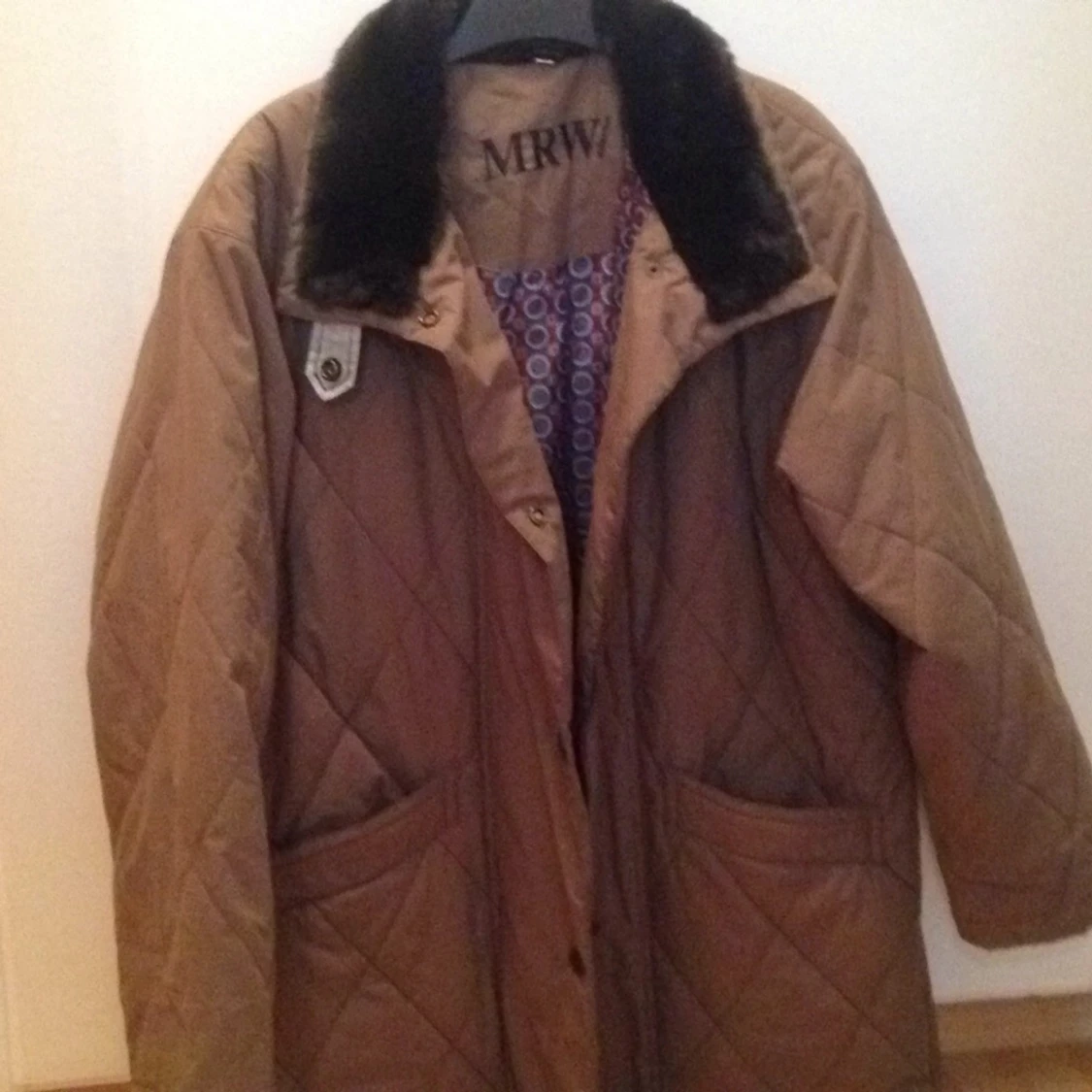 Härlig jacka med blankt innertyg och en mjuk pälskrage i fuskpäls. Märke: MRW collection. Köpt second hand!
