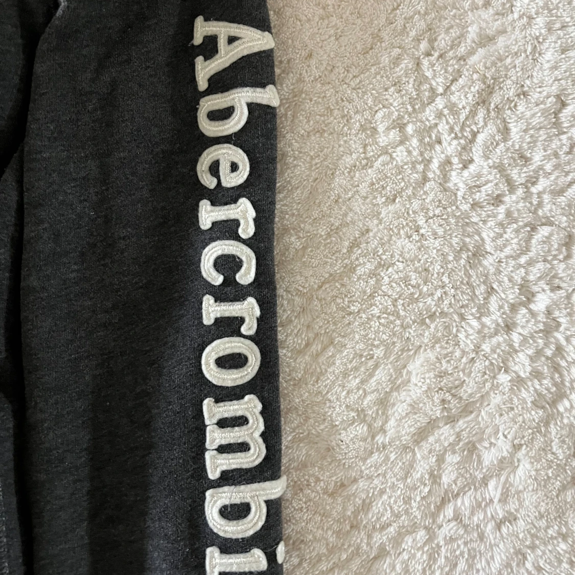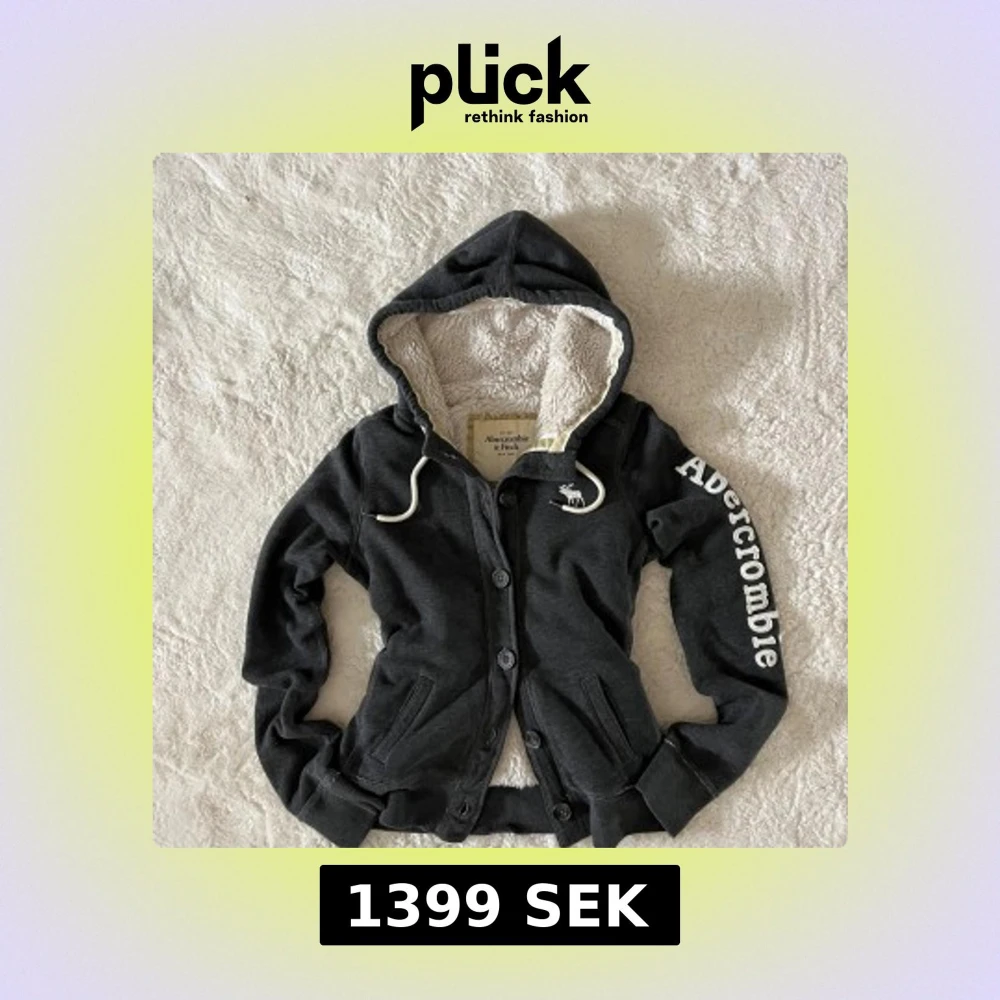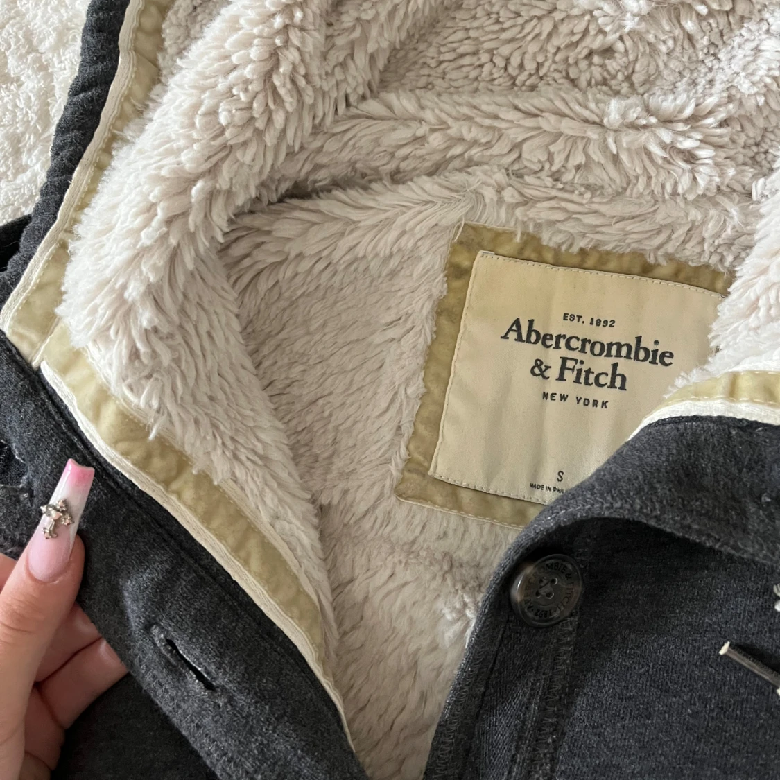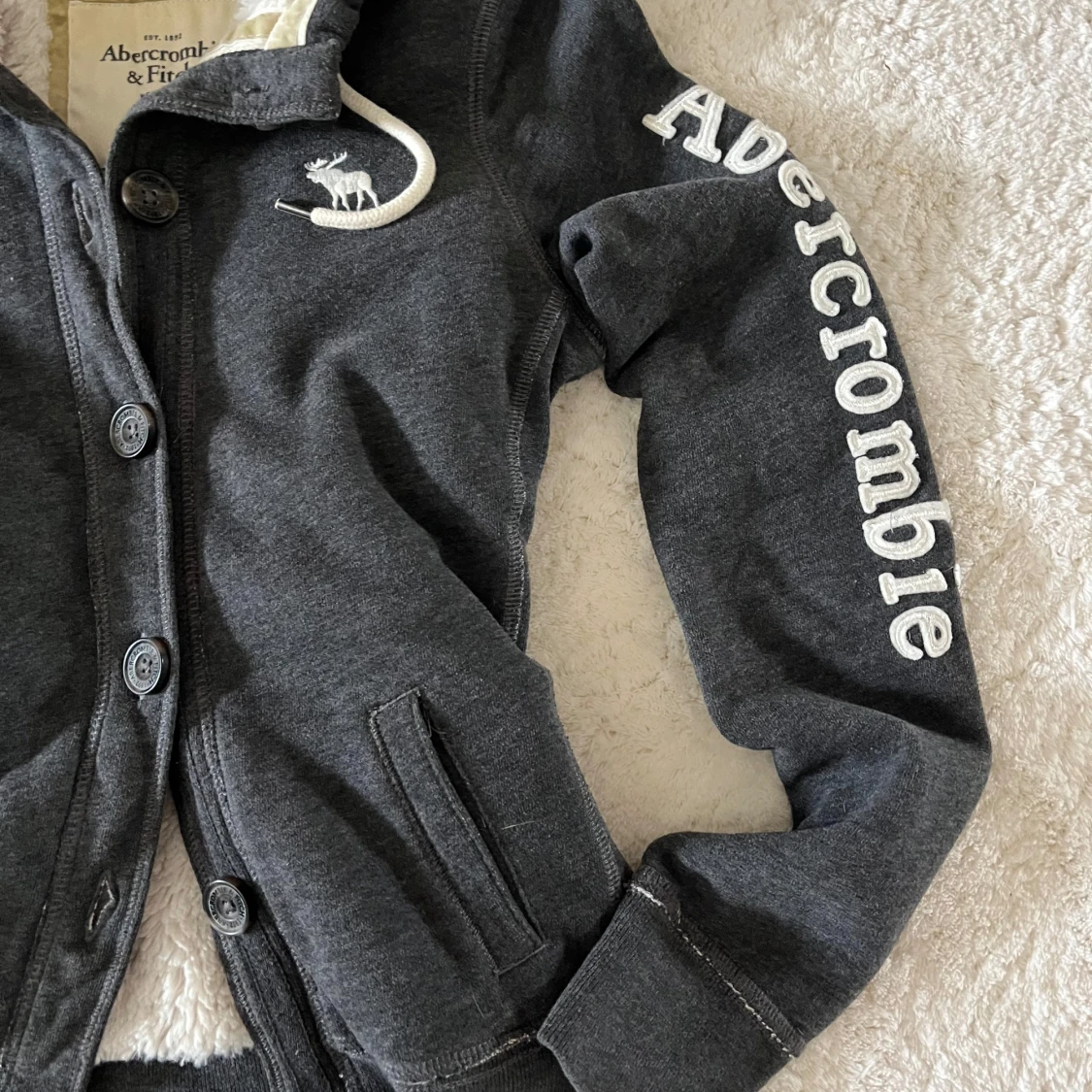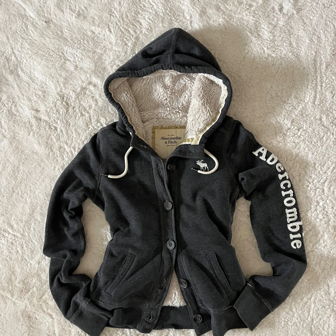 Svart teddyjacka från Abercrombie & Fitch med vit broderad logga på ärmen och moose-detalj på bröstet. Jackan har huva med vit fluffig teddyfoder, knäppning med knappar och två fickor framtill. Perfekt för kyliga dagar och riktigt skön att ha på sig.