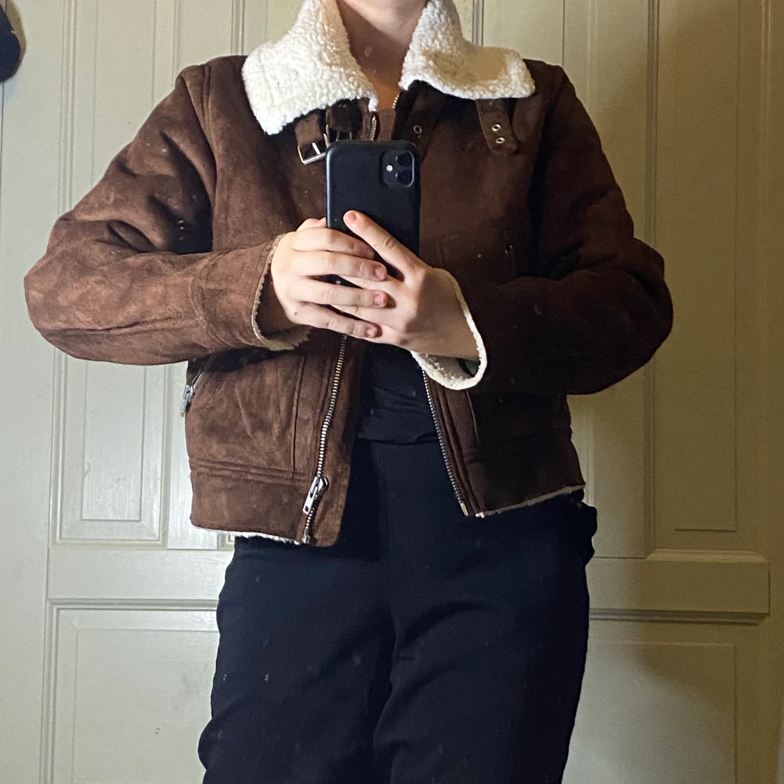 Oanvänd fin brun höstjacka från weekday. Strlk Small. Går till midjan på mig. Varm och väldigt mysig. Brun mocka på utsidan och fake ull på insidan. Köpt för 800 säljer för 500