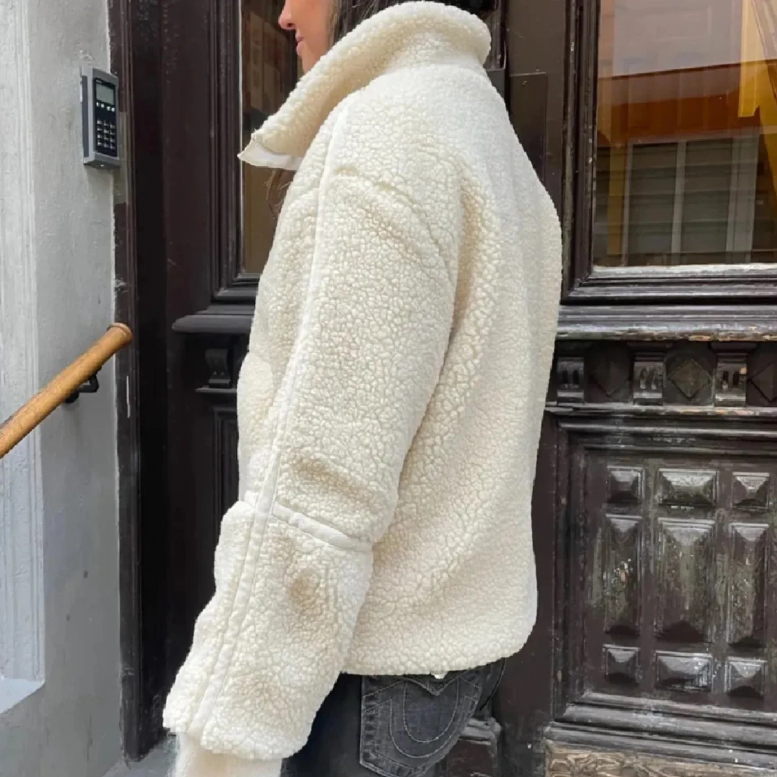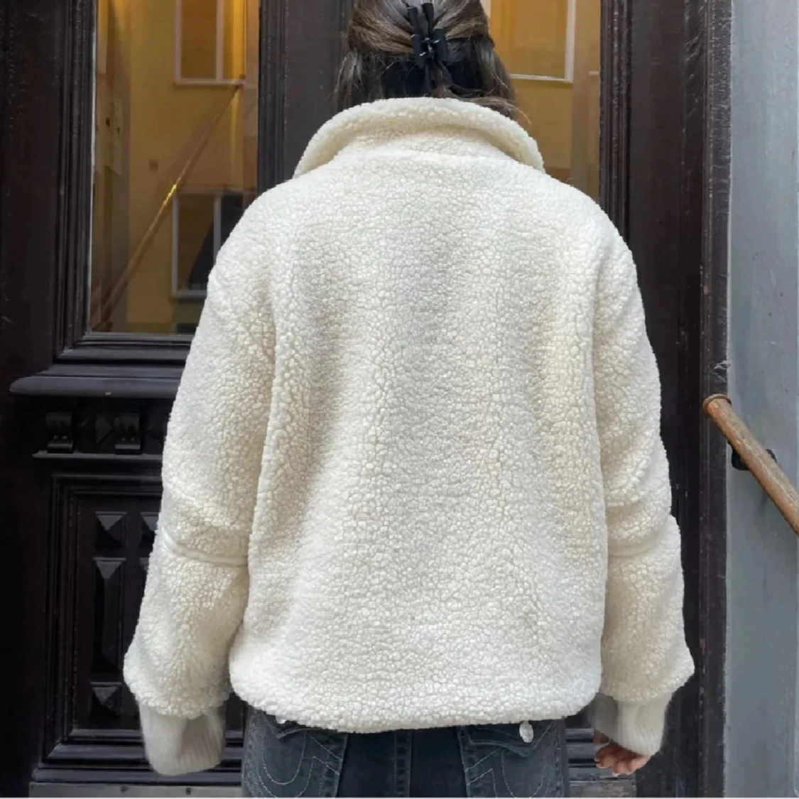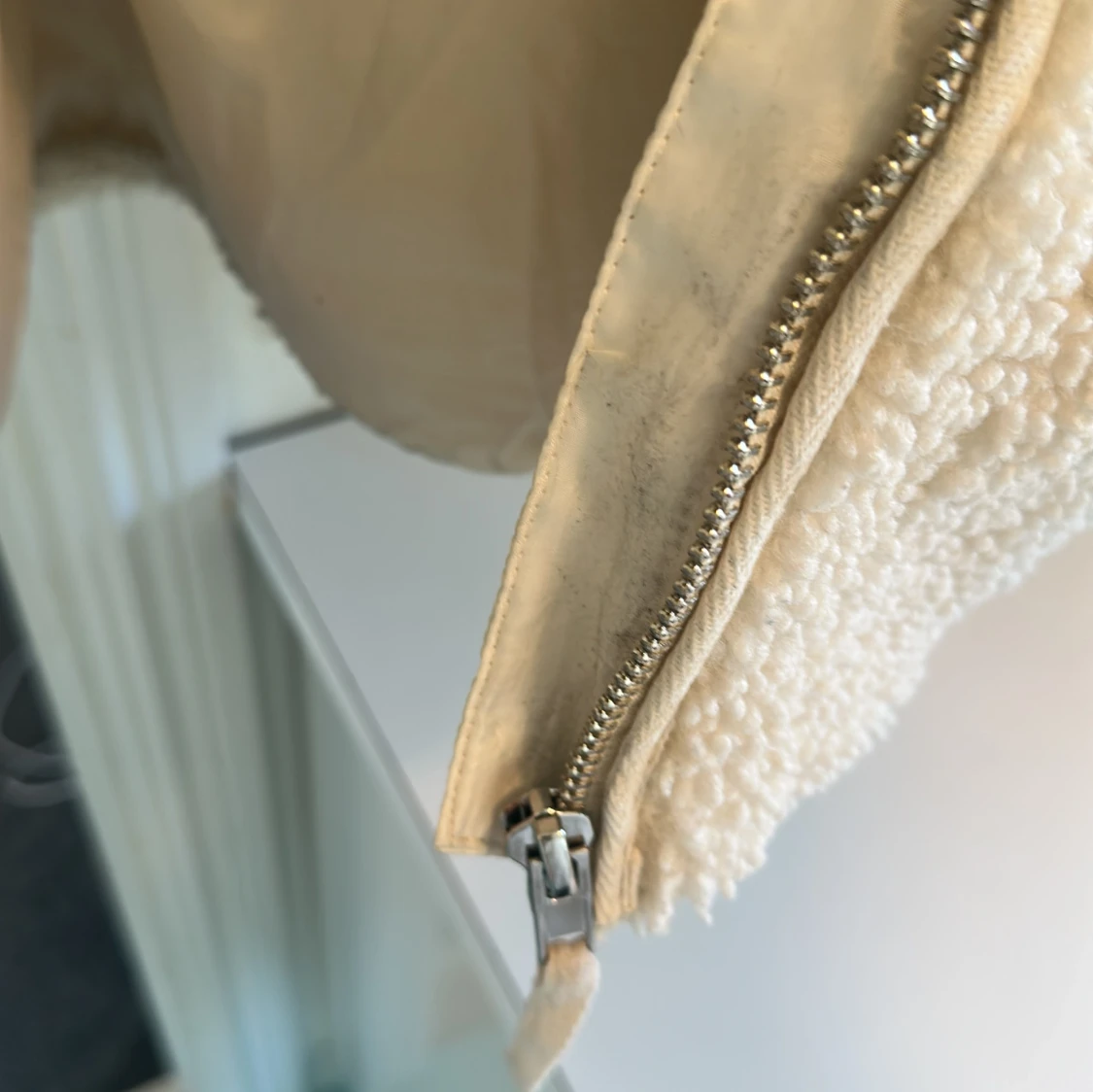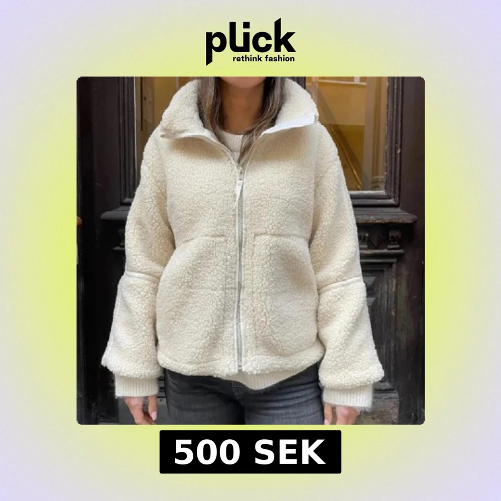 Mysig vit teddyjacka med hög krage och dragkedja framtill. Jackan har två stora fickor och är tillverkad i fluffigt teddy-material som håller dig varm. Perfekt för kyliga dagar och har en avslappnad, loose passform med långa ärmar. Bilderna är lånade men kan absolut skicka egna bilder ifall ni vill ha det! Det märks lite vid dragkedjan att den har används men det inte inget man ser! Kolla bild 4