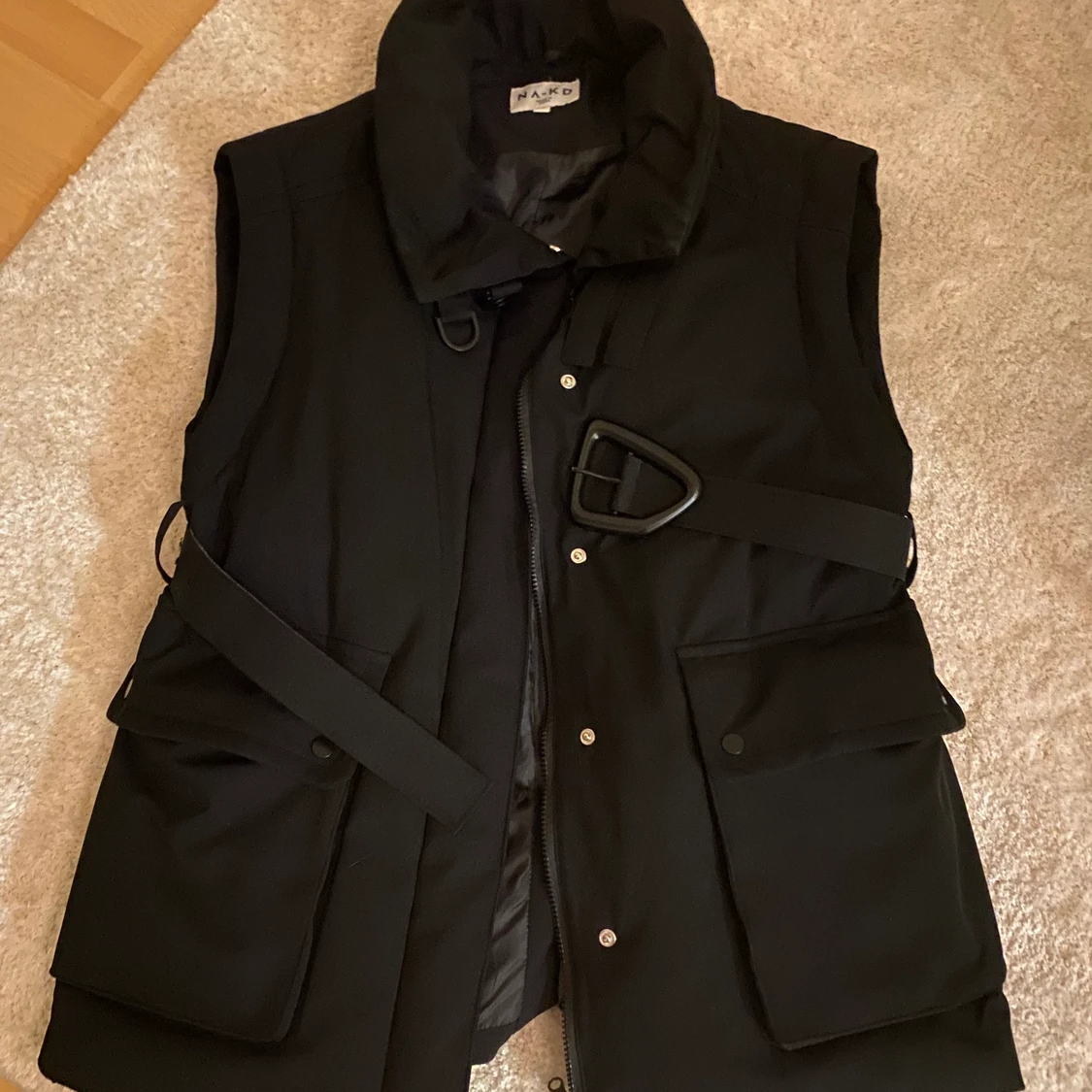 Svart fodrad väst från NA-KD, oversized i modellen. Kan bäras med ett medföljande bälte i midjan eller utan. Dragkedja och knappar fram, en hög krage som man kan välja att knäppa eller inte.