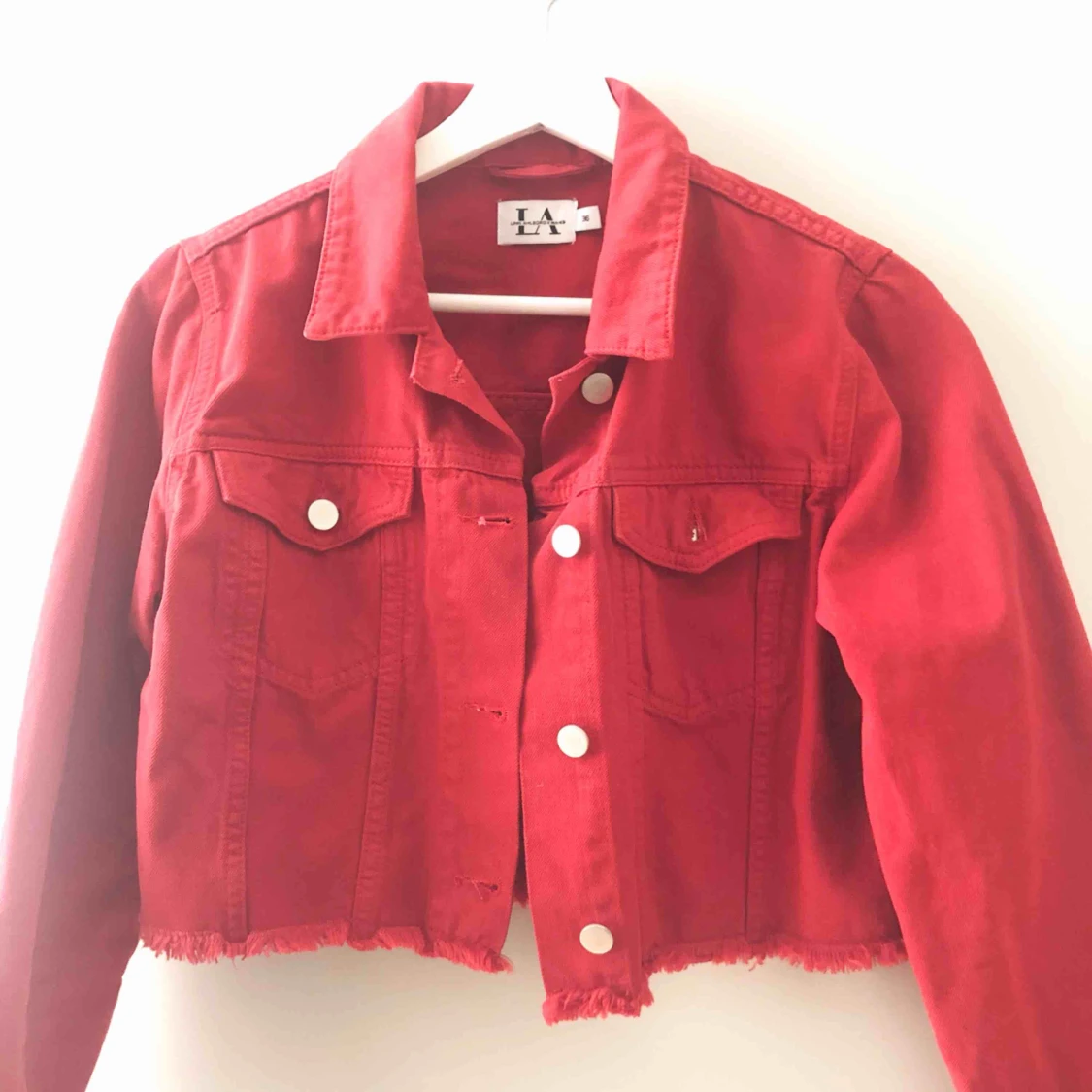 Snygg röd croppad jeansjacka från Linn Ahlborg x nakd. Köparen står för frakt.