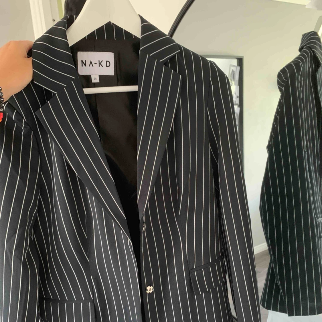 Jättefin randig kavaj från NAKD. Fattas ett skärp för att nakd glömde att skicka med det:) storlek 34, passar mig som brukar ha storlek S. Använd 2 ggr! Möts upp i Stockholm, annars betalar köparen frakten!