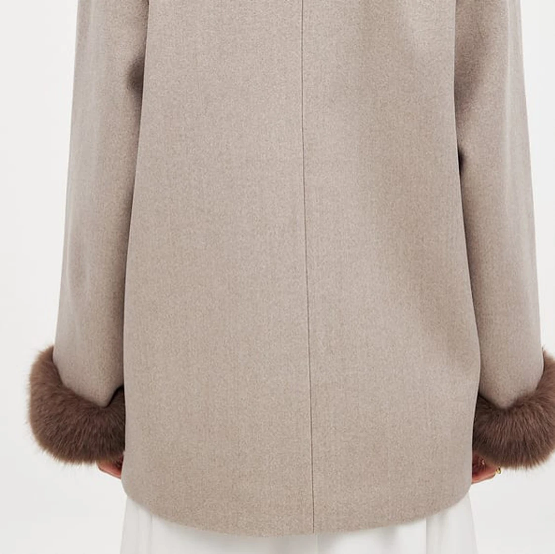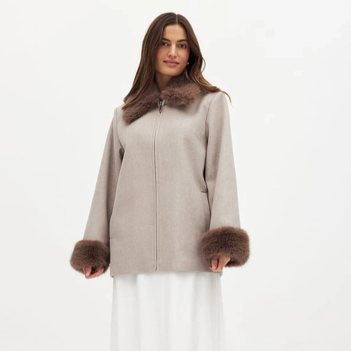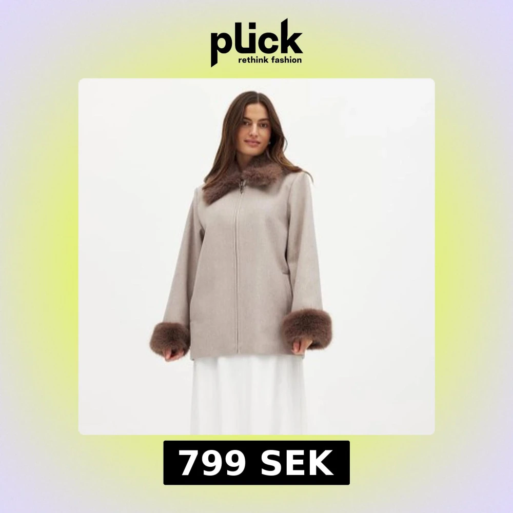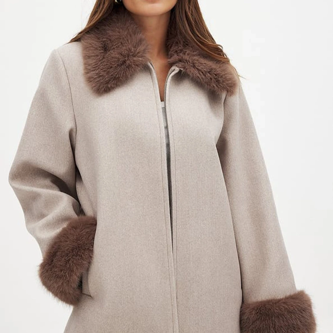 Säljer en stilren beige kappa med mjuka bruna fuskpälsdetaljer vid krage och ärmslut. Jackan har rak passform, dragkedja framtill och långa ärmar. Perfekt för dig som vill ha en klassisk look med en twist. Köpt för 1100kr. Helt ny och oanvänd, därav inga defekter!🤎