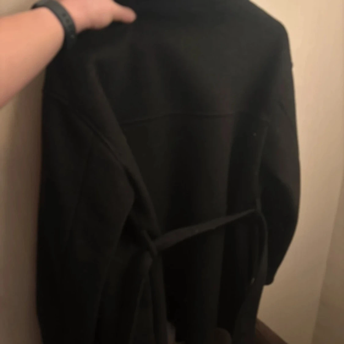 Elegant svart kappa från NA-KD i storlek 36. Den har en klassisk design med knytbälte i midjan och långa ärmar. Perfekt för kyligare dagar med sin stilrena look, passar bra vår å höst - ”luddigt” material