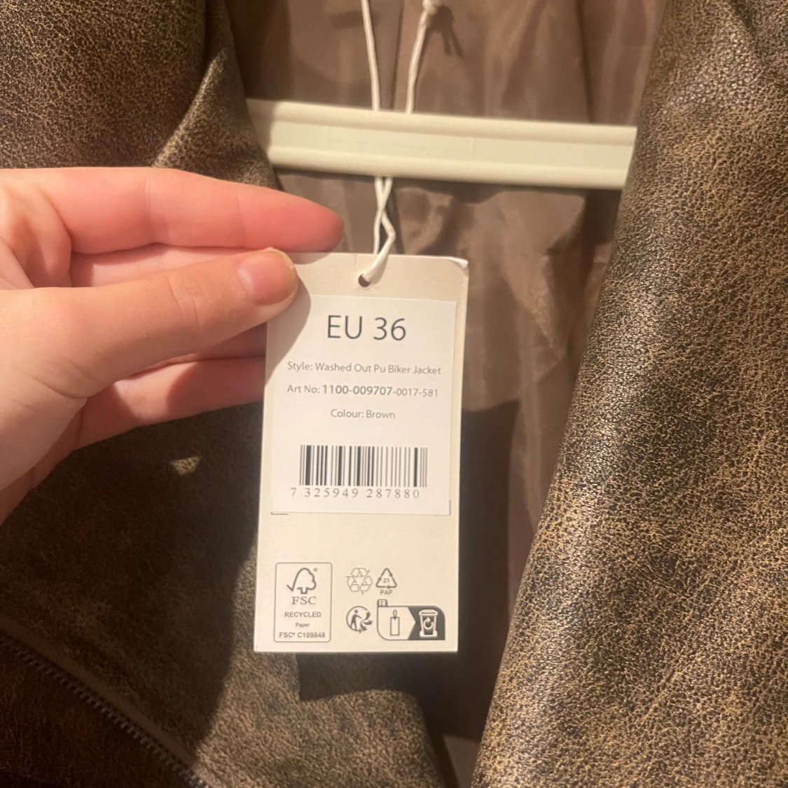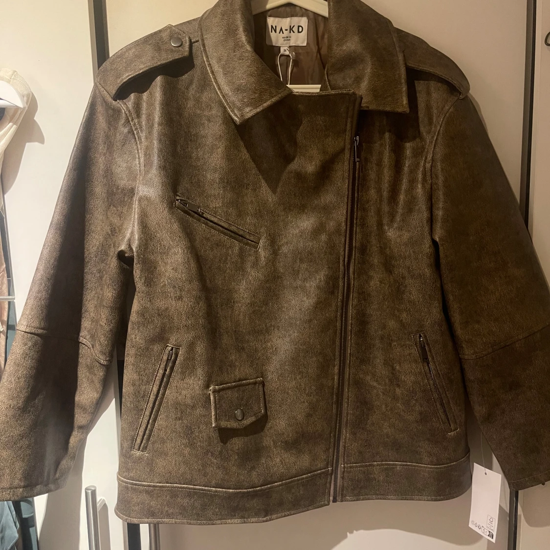 Säljer en brun bikerjacka från NA-KD i PU-material med cool washed out-effekt. Jackan har bred krage, sned dragkedja, flera fickor med dragkedja och en liten ficka med knapp. Den är helt ny med prislapp kvar i storlek 36. Nypris 1099 säljer för 750 men pris kan diskuteras