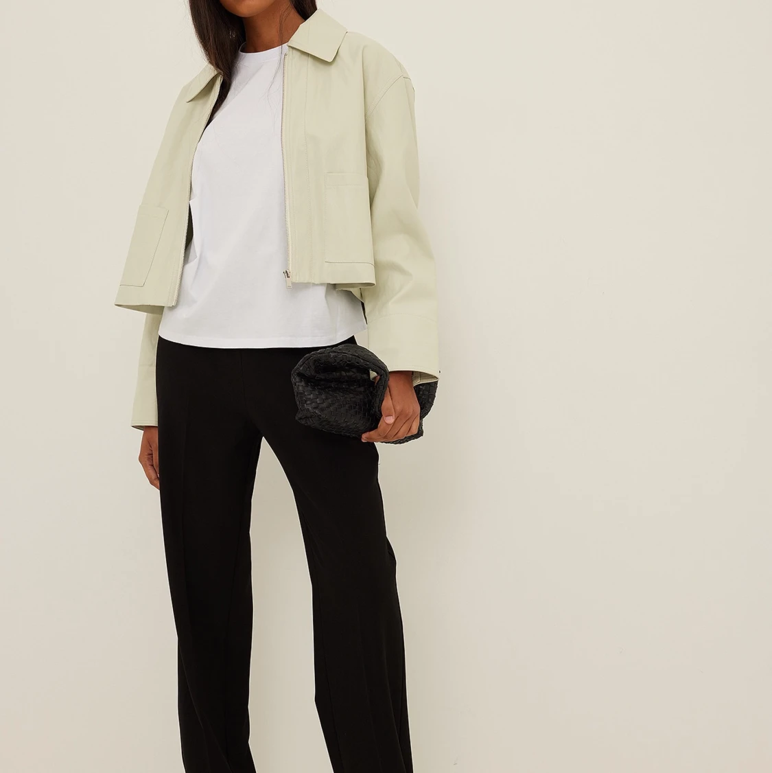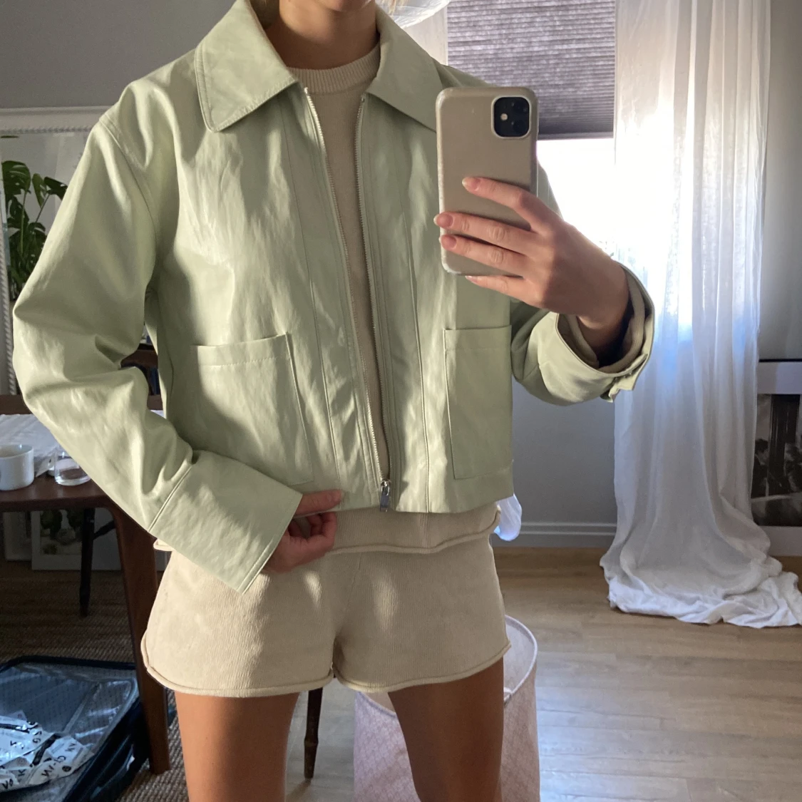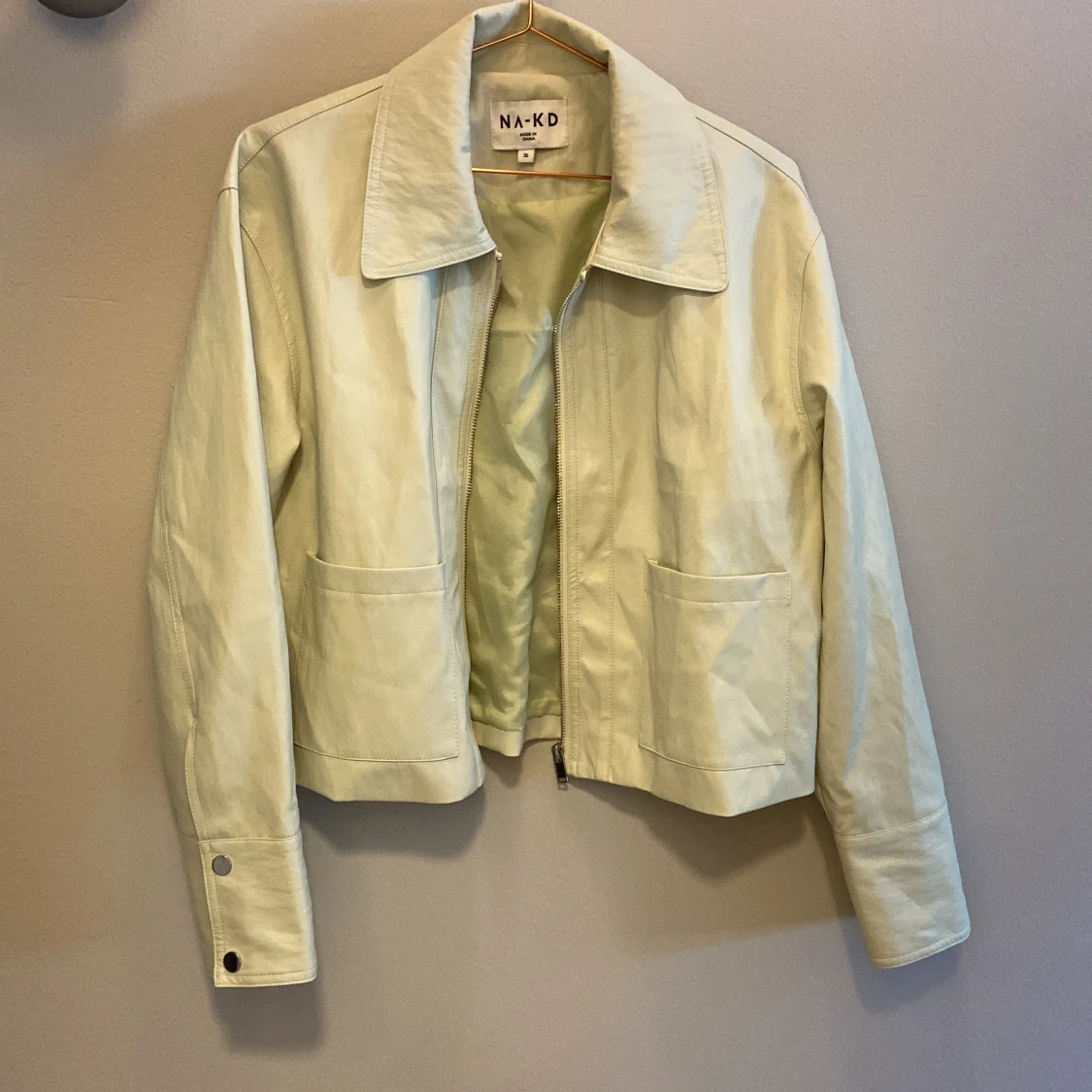 PU-läderjacka från NAKD. Knappt använd. Väldigt ljusgrön/vit-ish färg. 💚
