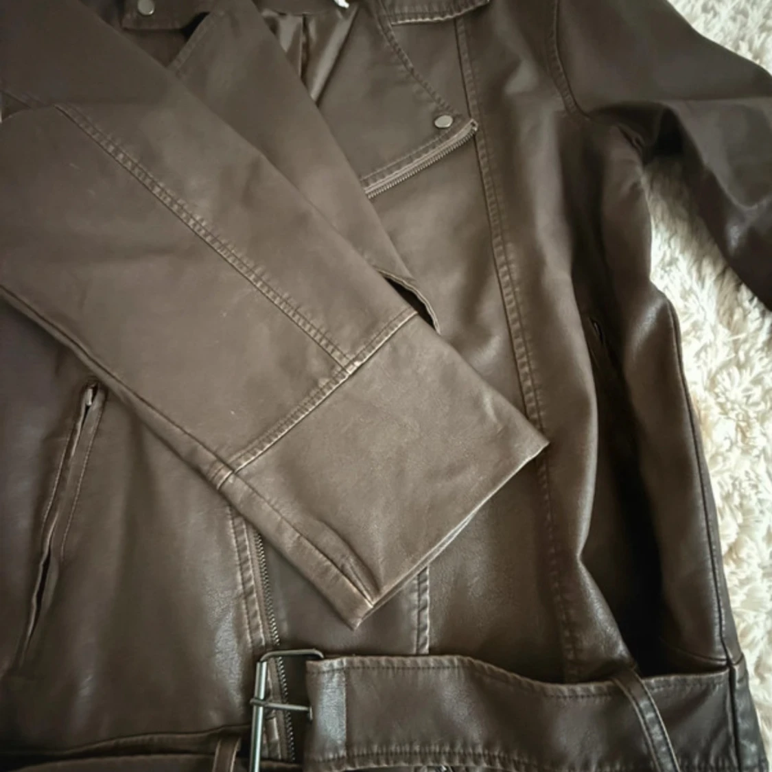 Snygg brun skinnjacka med klassisk bikerstil. Jackan har långa ärmar, dragkedja framtill, detaljerade sömmar och ett justerbart bälte i midjan.
